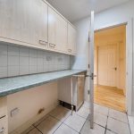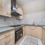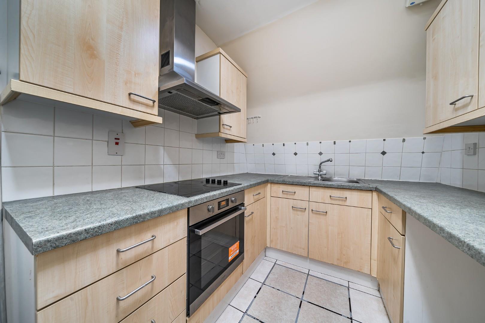 Compact yet efficiently designed, the kitchen features a range of light wood cabinetry paired with grey countertops. It incorporates essential appliances including a built-in oven and hob, complemented by tiled flooring and partial tiled walls that enhance its practicality and ease of maintenance.