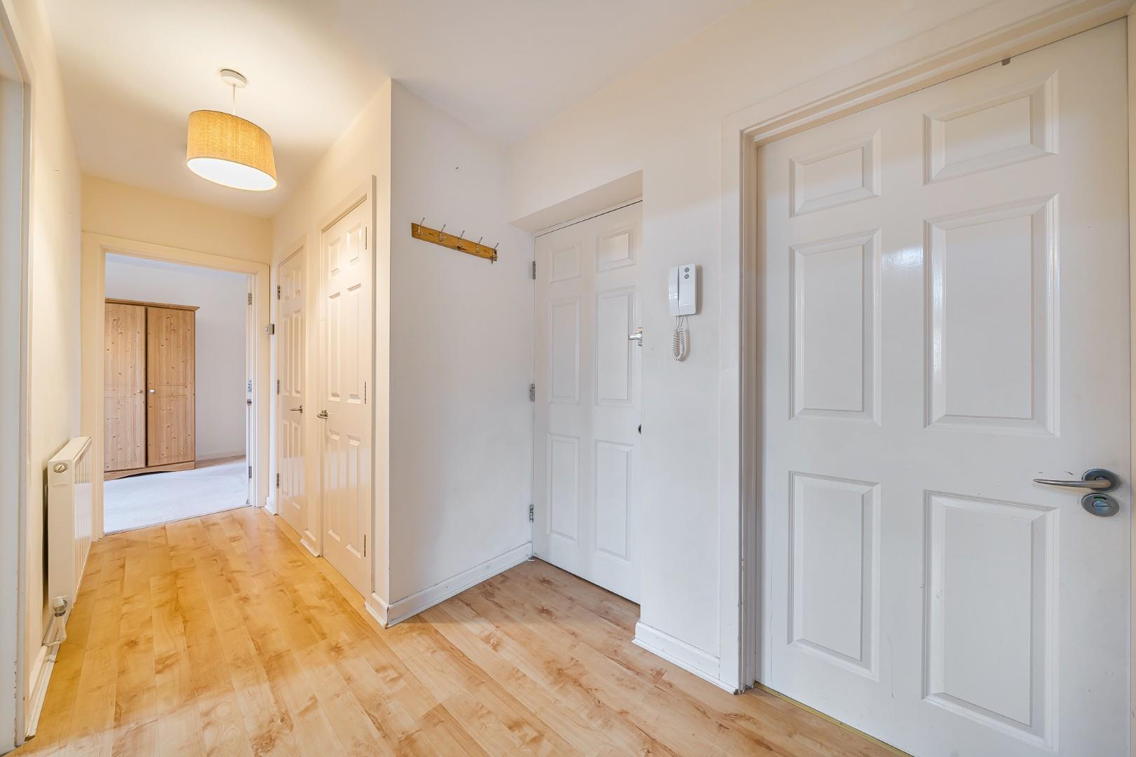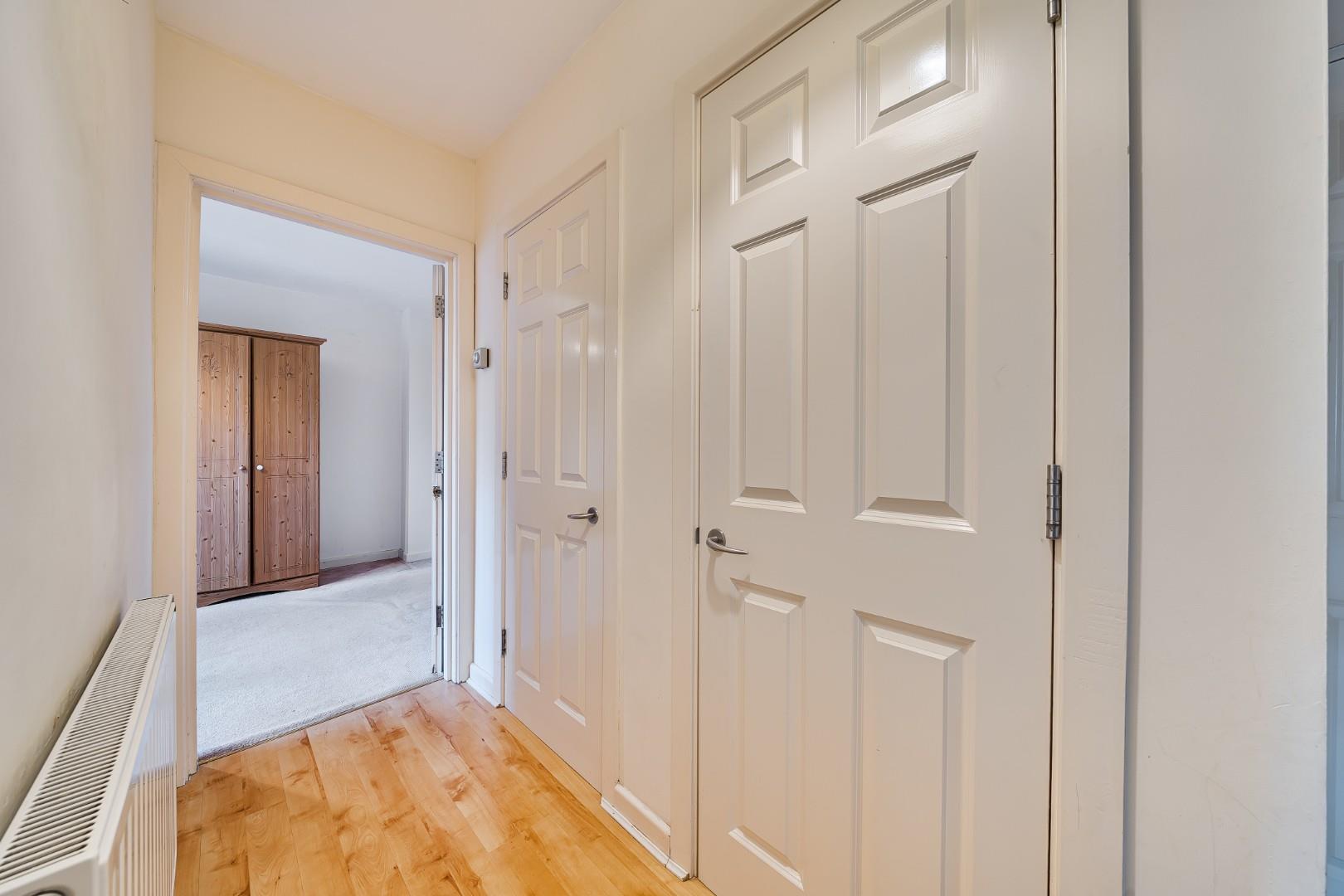 The entrance hall is a welcoming space measuring 7'10 by 5'6, with wood-effect flooring and neutral walls. It provides access to the principal rooms and includes storage cupboards for convenience.