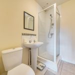 The shower room is compact and practical, measuring 6'7 by 5'1. It includes a corner shower cubicle, pedestal basin, and WC, with tiled flooring and light walls for an easy to maintain finish.