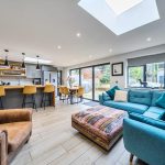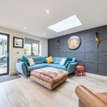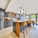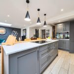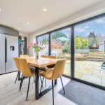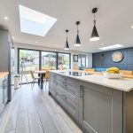 A superbly designed open-plan kitchen and dining room, measuring 22'2" by 19'3" at its maximum. The space is bright and welcoming, featuring a large island with a white countertop and grey cabinetry, complemented by three pendant lights above. There is ample storage and integrated appliances within the kitchen area. The dining area benefits from wide floor-to-ceiling doors that open out to the garden, offering plenty of natural light and a seamless connection to the outdoors. The room also includes skylights which enhance the light-filled ambiance, alongside stylish wooden flooring throughout, and a feature dark grey panelled wall adding character to the living space.