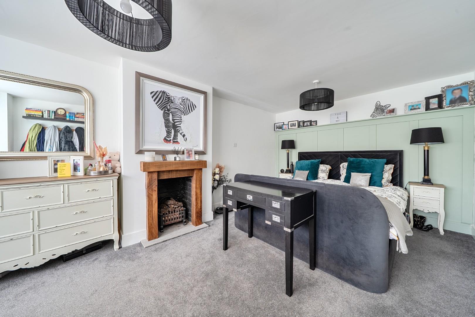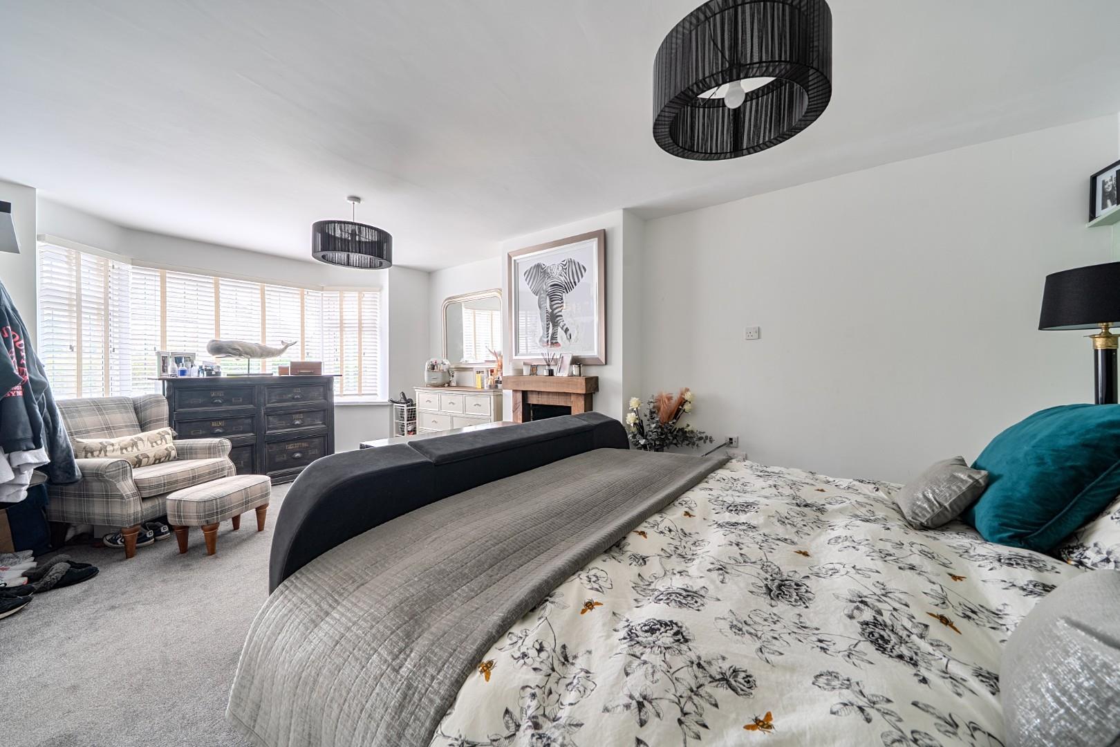 Bedroom 1 is a spacious main bedroom measuring 15'1" into the bay by 10'3". It features a large bay window that offers an abundance of natural light and charming views. The room is carpeted and decorated in a neutral palette, creating a calm and restful environment.
