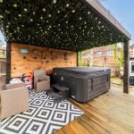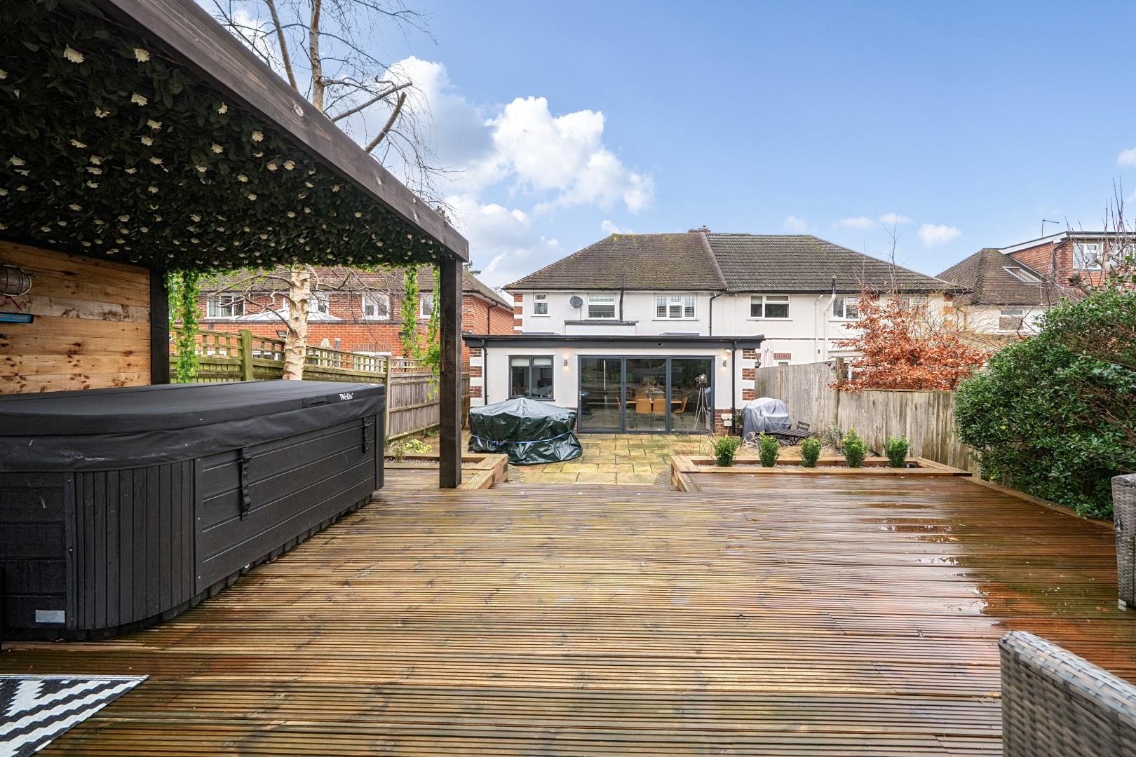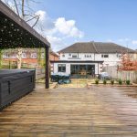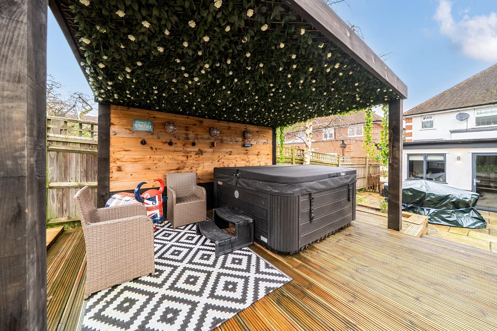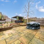 The rear garden is a generous and well-maintained outdoor space, mainly paved with stone slabs, bordered by planted beds and mature shrubs. There is a raised decking area with seating and a covered pergola housing a hot tub, offering a perfect spot for relaxation and entertaining. Beyond the patio, the garden continues with a lawn and a garden shed, providing additional storage and green space.