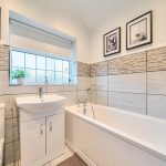 The family bathroom is fitted with a white suite including a bath with shower attachment, a sink with vanity storage beneath, and a WC. The walls are tiled in neutral tones with decorative accents, and there is a window for ventilation and natural light.
