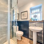 A modern and stylish shower room featuring a walk-in shower with glass door, a pedestal sink, and a WC. The room is decorated with tiled walls in a grey palette complemented by dark wainscoting and wooden-effect flooring, creating a sleek, contemporary feel. A frosted window allows light in while maintaining privacy.