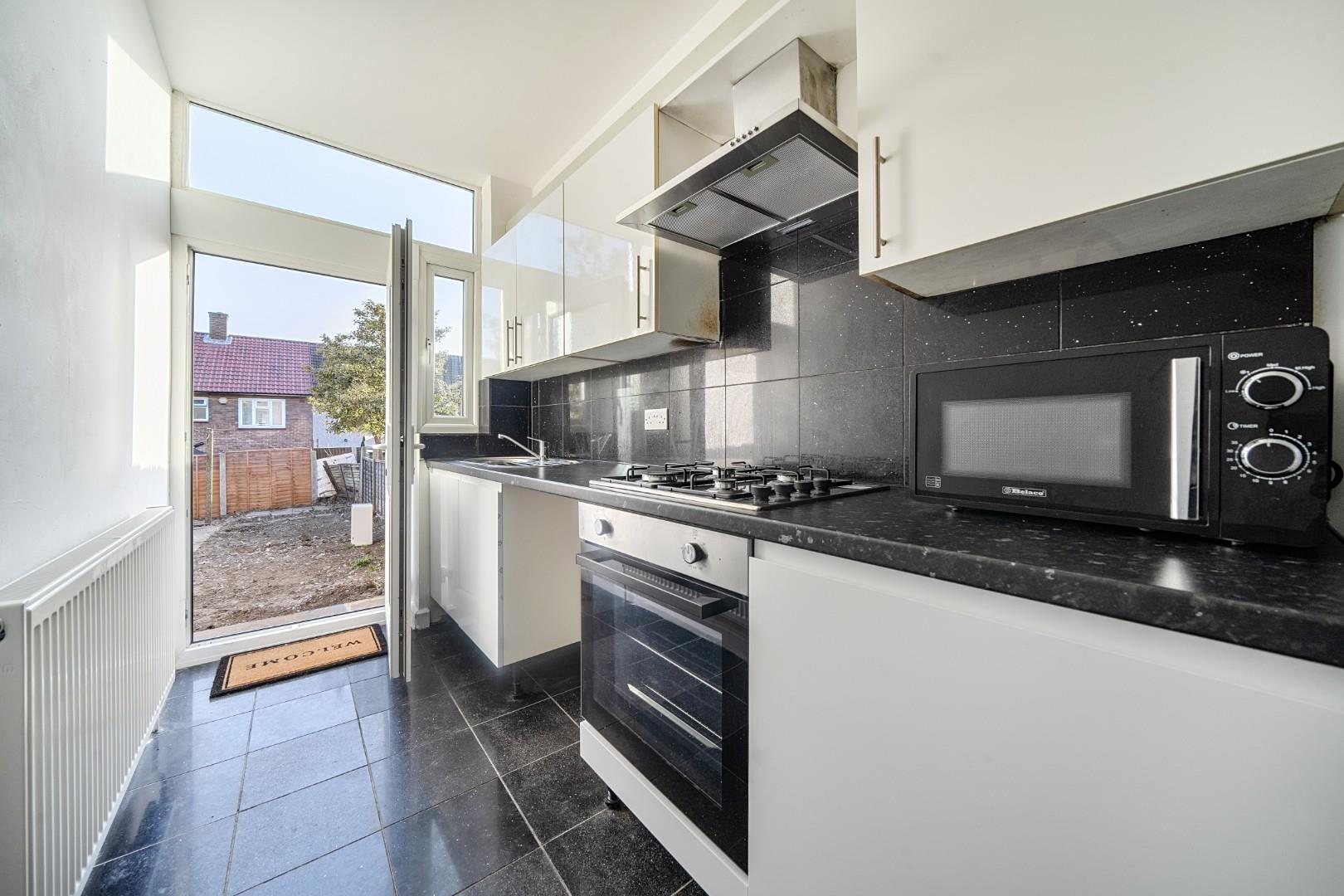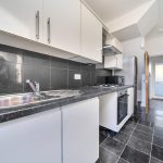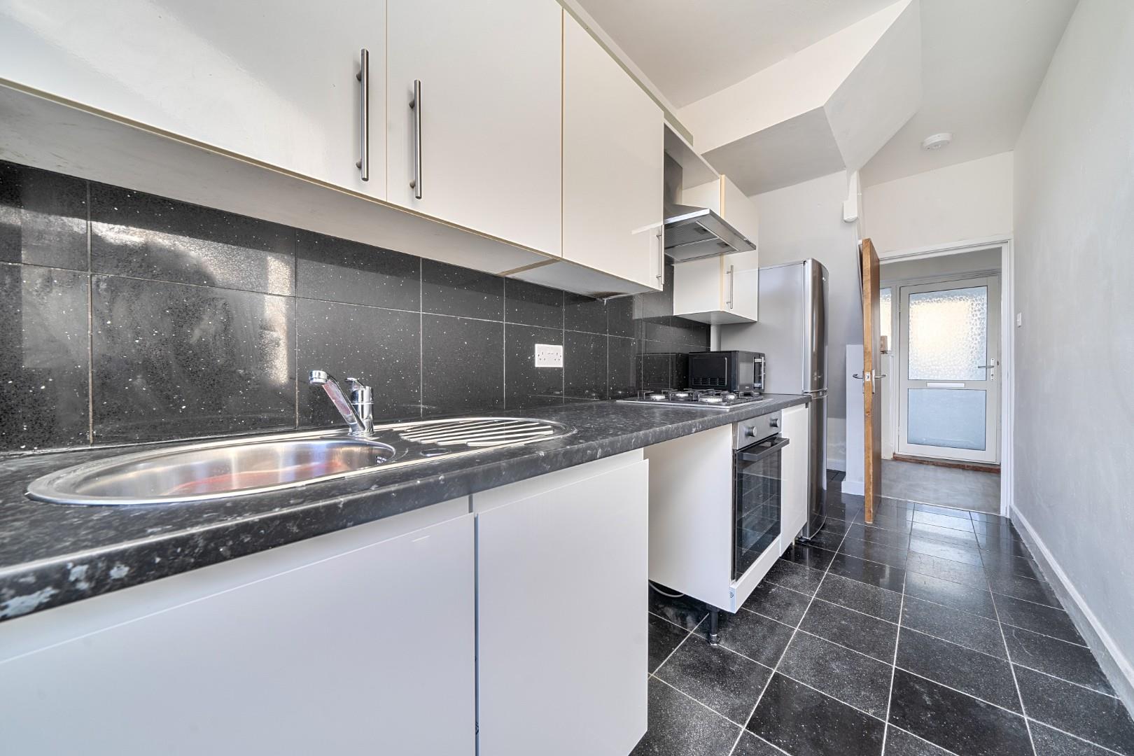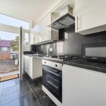 The kitchen is narrow and practical with sleek black tiled flooring and matching black wall tiles that contrast with the white cabinetry. It features essential appliances including a built-in oven and a gas hob, with ample work surfaces and storage. A door at the rear opens directly to the garden, offering easy access for outdoor dining or gardening.