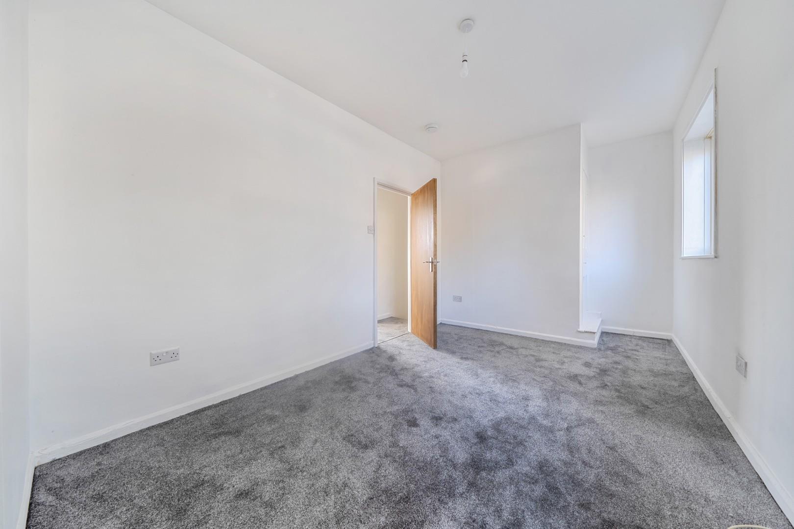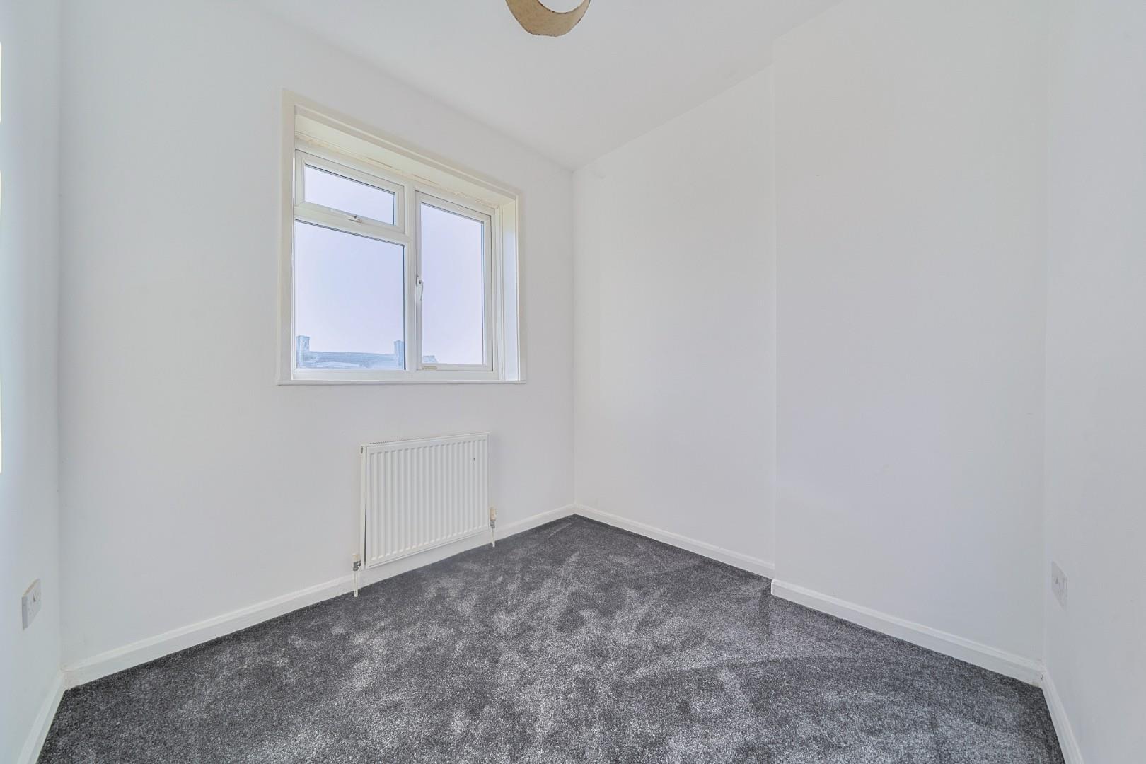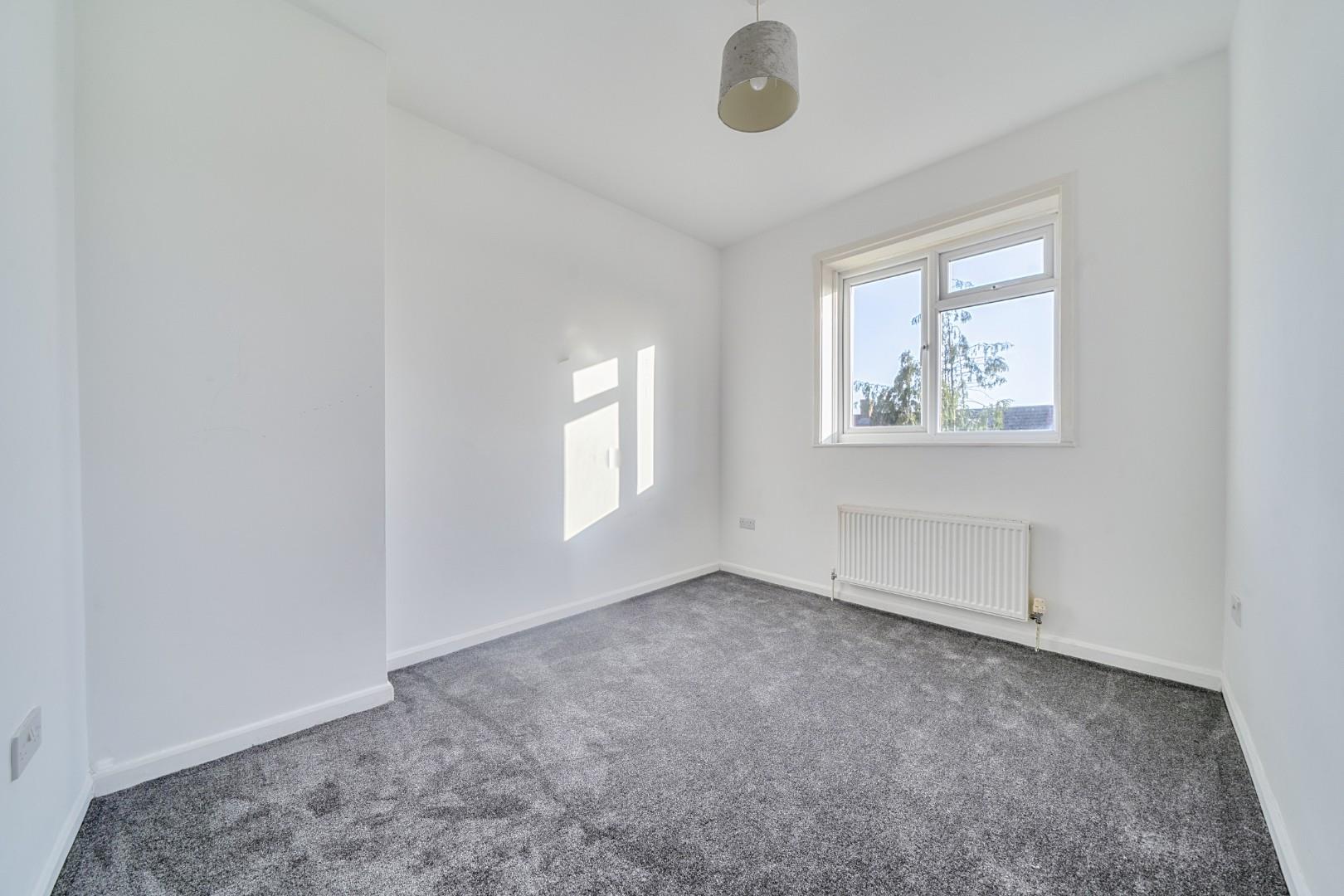Bedroom 3 is a smaller room with a window offering garden views. Finished with white walls and grey carpeting, it is ideal as a child's bedroom, study or hobby room.