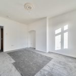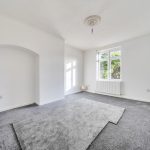 This welcoming reception room is bright and spacious, featuring a large window that allows plenty of natural light to fill the space. The room is neutrally decorated with fresh white walls and soft grey carpeting, creating a calm and inviting atmosphere. An alcove offers a subtle architectural detail, while the room's layout provides a versatile space suitable for relaxing or entertaining.