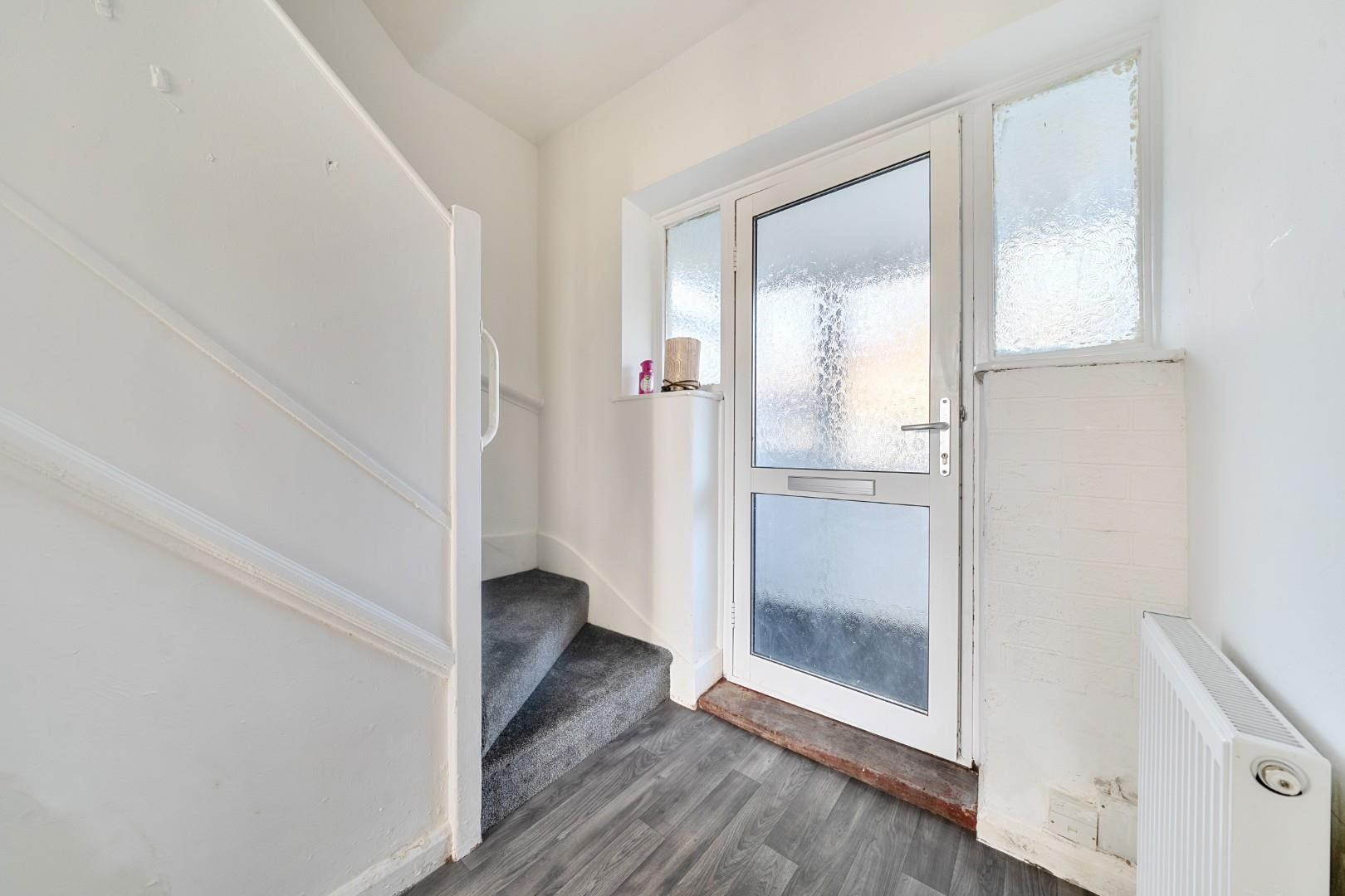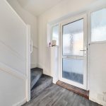 The hallway offers a practical entrance area with a coat cupboard for storage. It is finished with neutral walls and dark vinyl flooring that leads towards the stairs and into the kitchen and reception room, creating a functional flow within the home.
