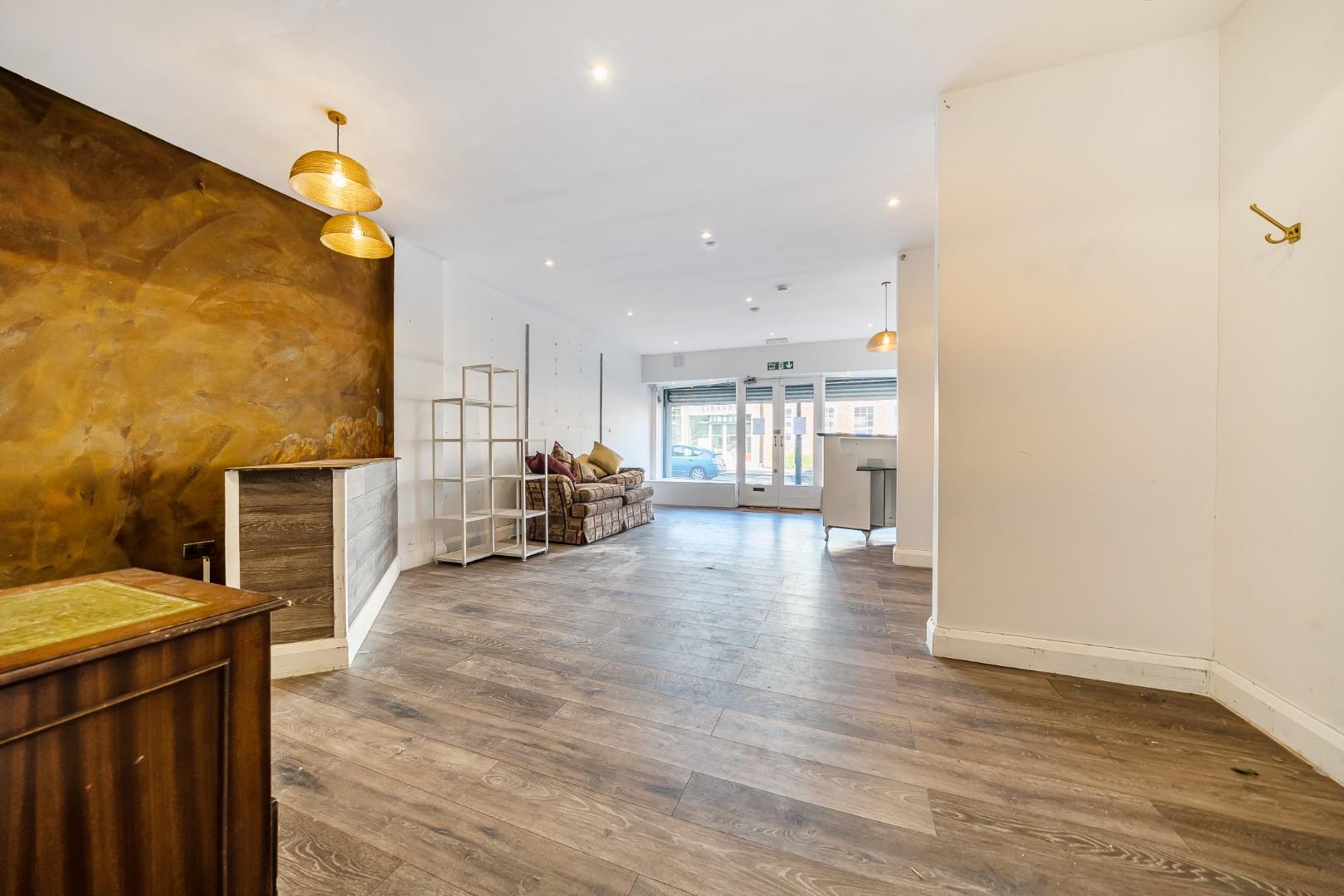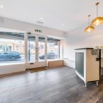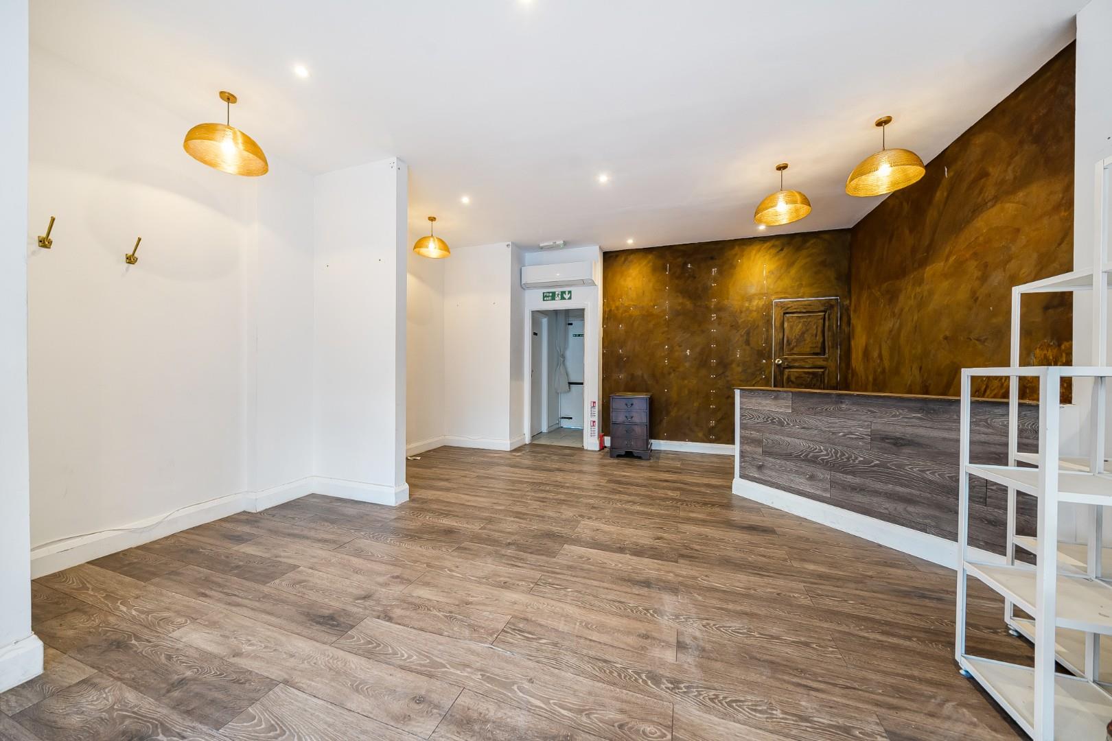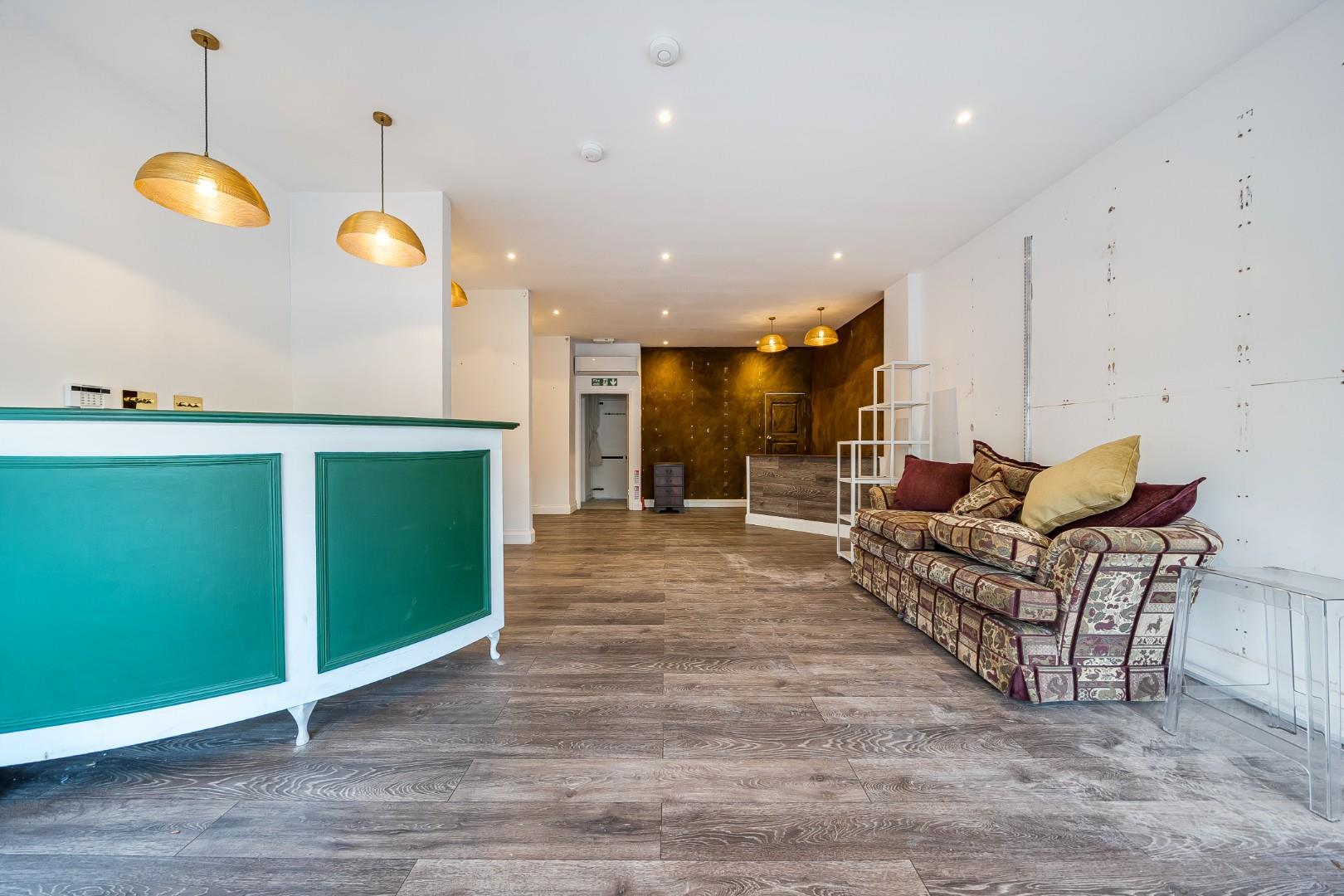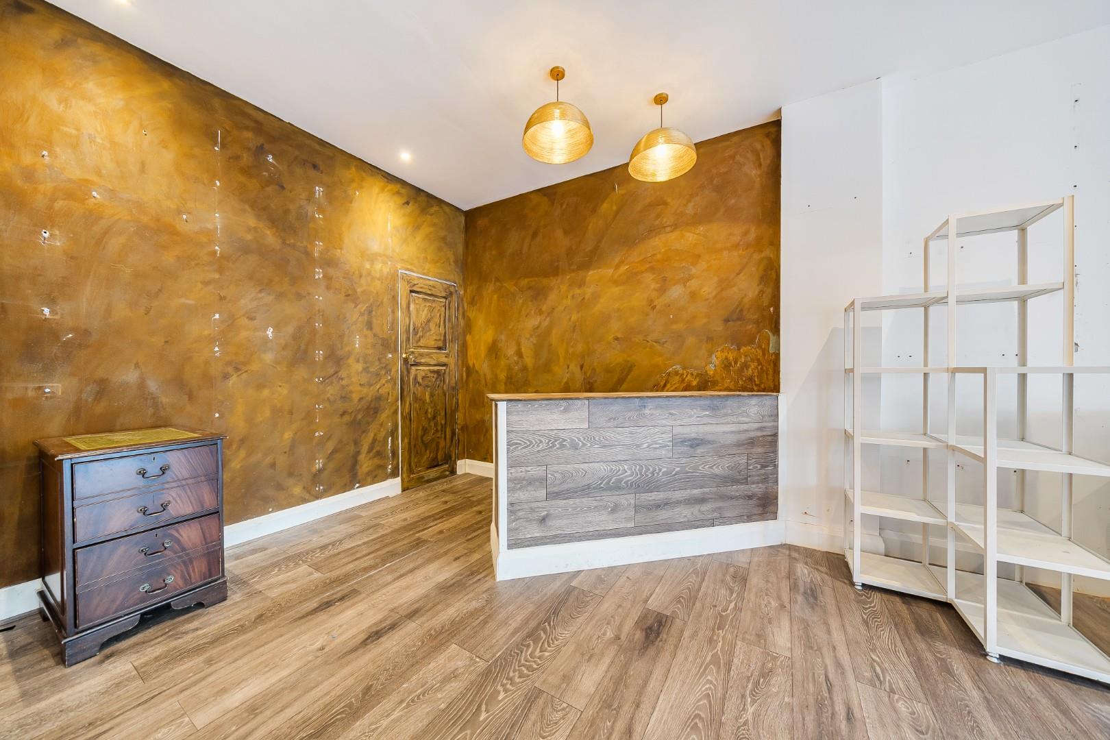 This spacious shop offers a bright and inviting open-plan area with ample natural light streaming through large front windows and a central double-door entrance. The wooden flooring extends throughout, creating a warm and cohesive environment. A curved reception desk is positioned near the front, complemented by pendant lighting and a feature wall with a textured finish adding character to the space. Towards the rear, a small store room provides practical storage, while an adjacent WC with a sink is finished in contemporary tones, including a dark green accent wall. The shop is well-lit with recessed ceiling lights, and the overall layout is versatile, suitable for various business uses.