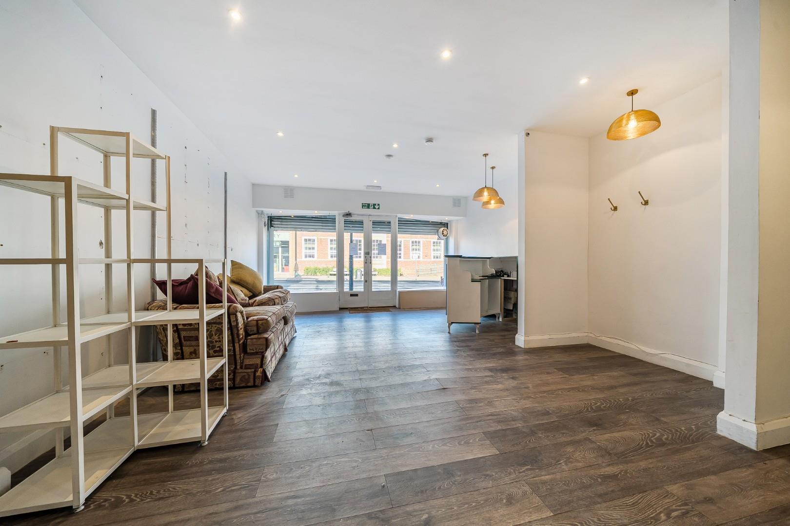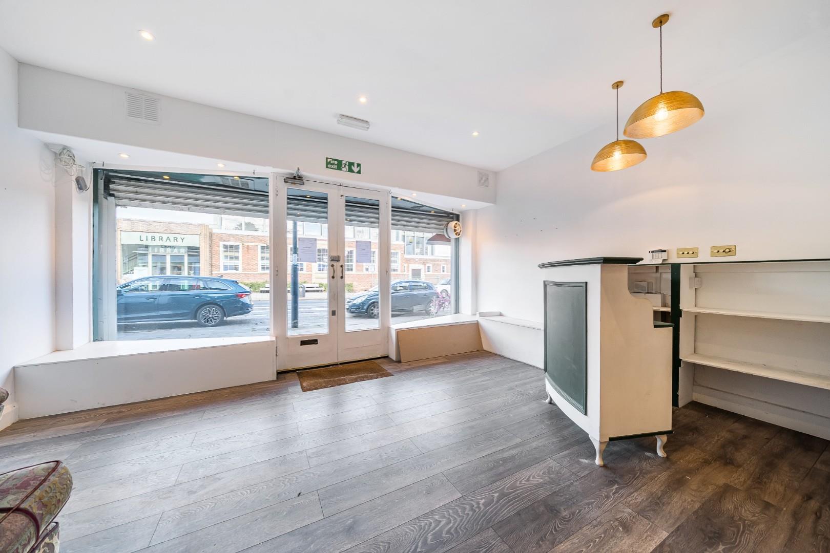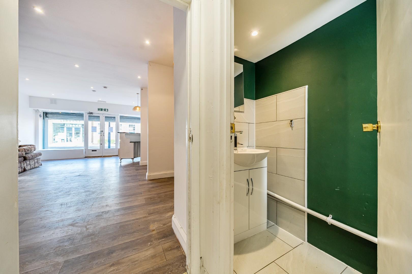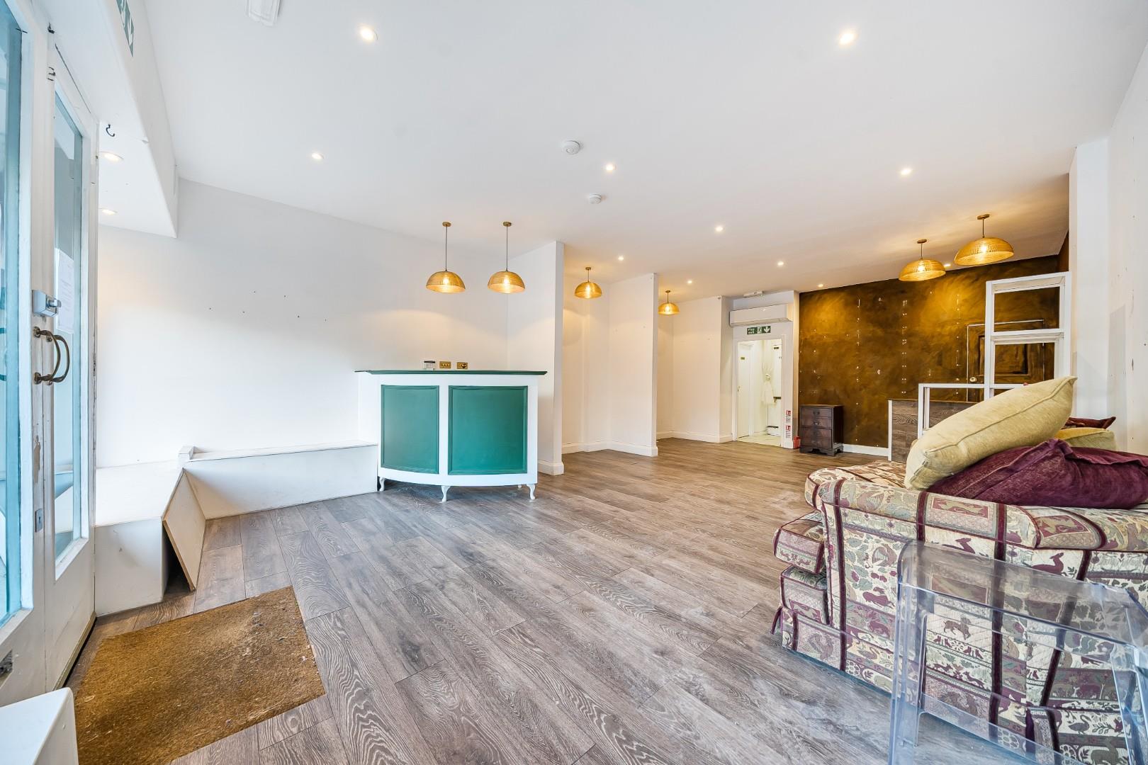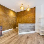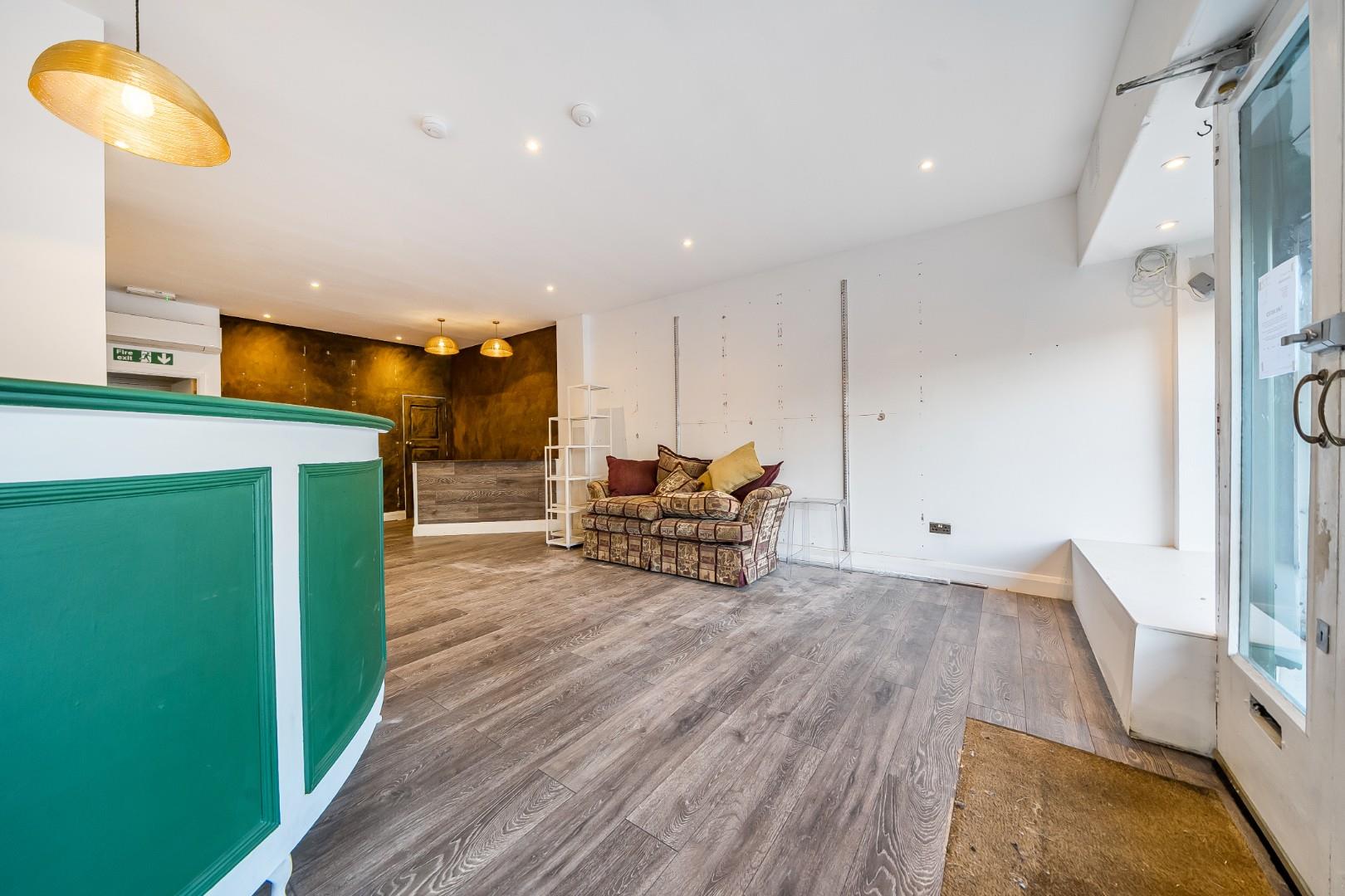 This spacious shop offers a bright and inviting open-plan area with ample natural light streaming through large front windows and a central double-door entrance. The wooden flooring extends throughout, creating a warm and cohesive environment. A curved reception desk is positioned near the front, complemented by pendant lighting and a feature wall with a textured finish adding character to the space. Towards the rear, a small store room provides practical storage, while an adjacent WC with a sink is finished in contemporary tones, including a dark green accent wall. The shop is well-lit with recessed ceiling lights, and the overall layout is versatile, suitable for various business uses.