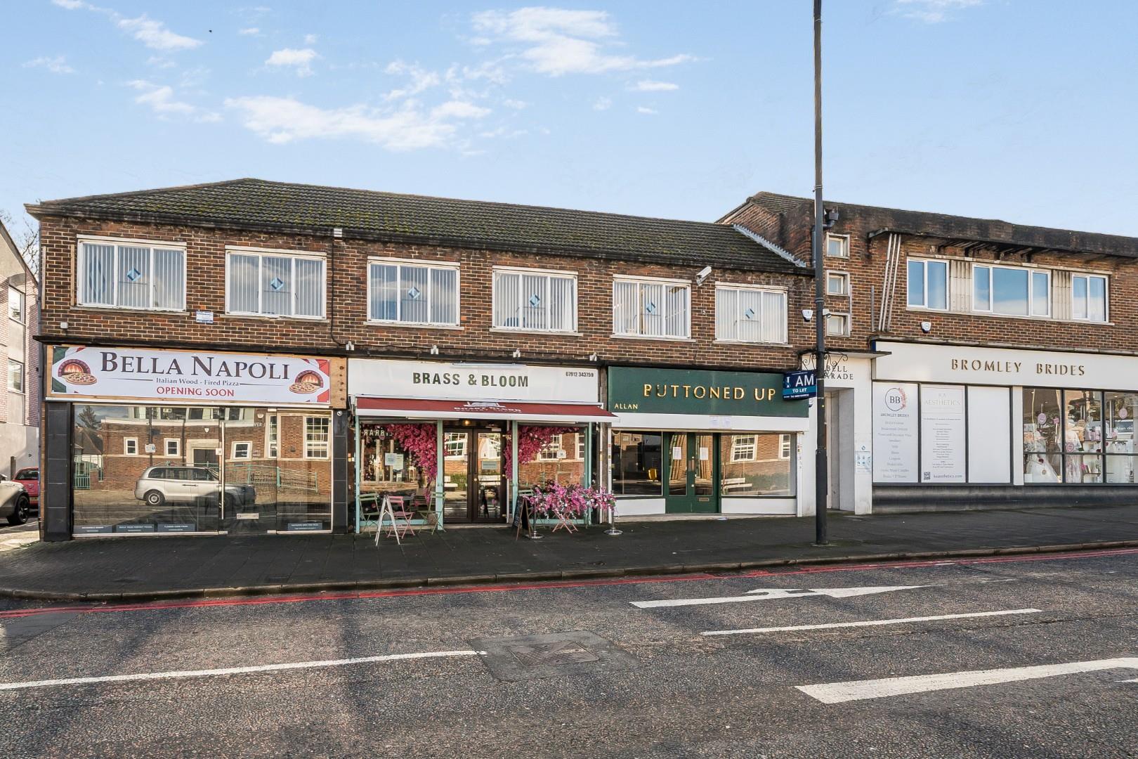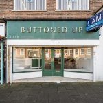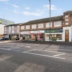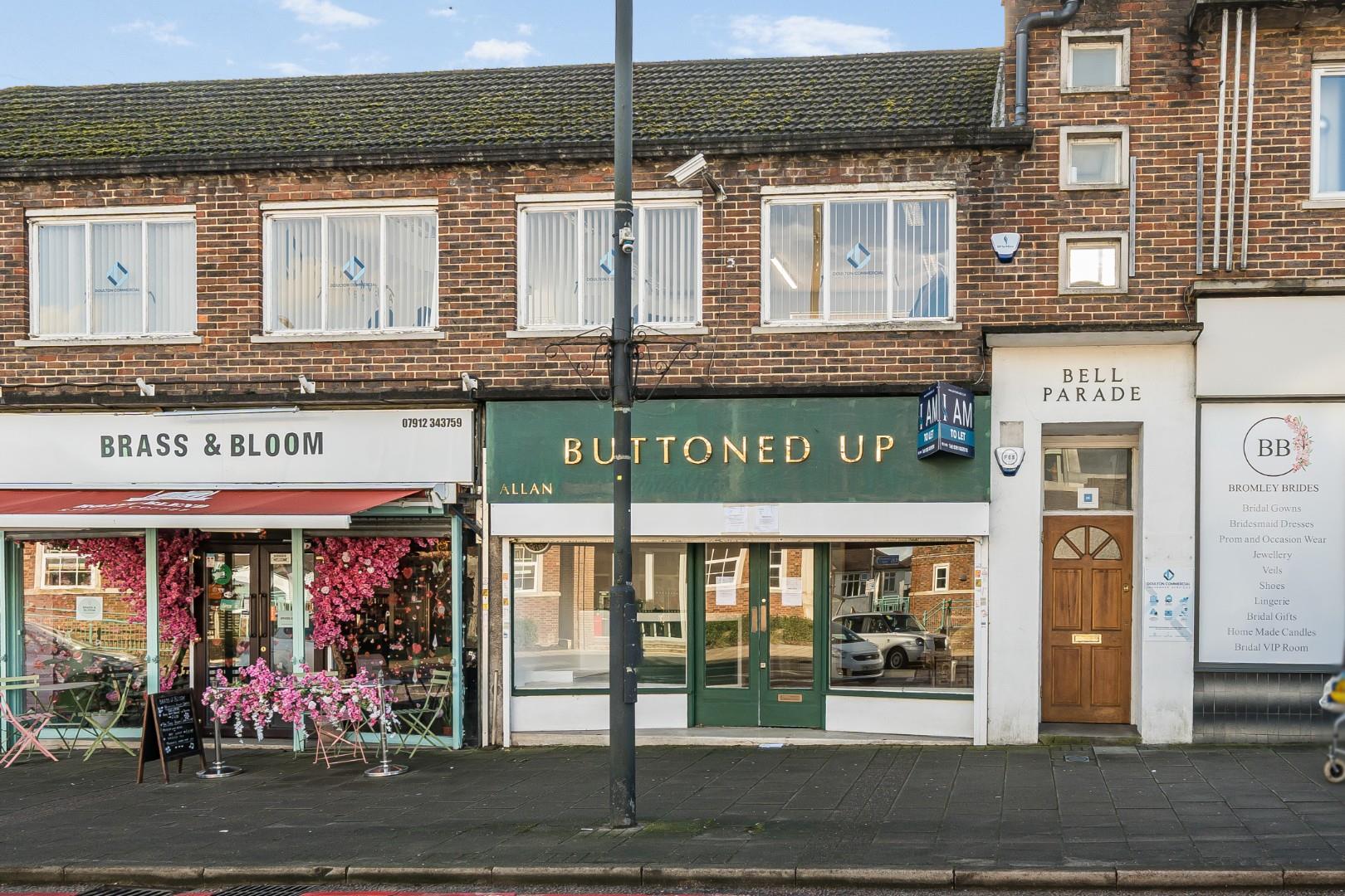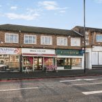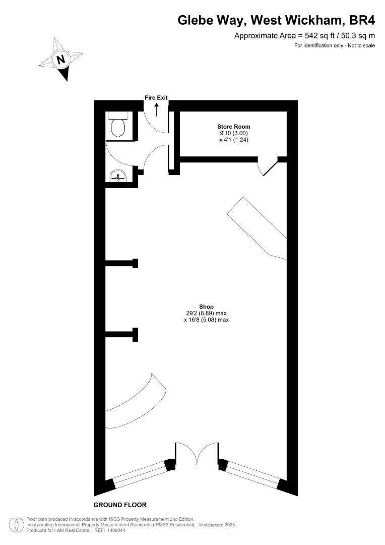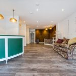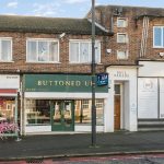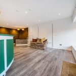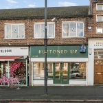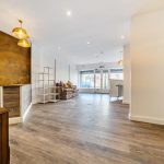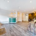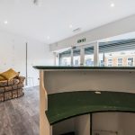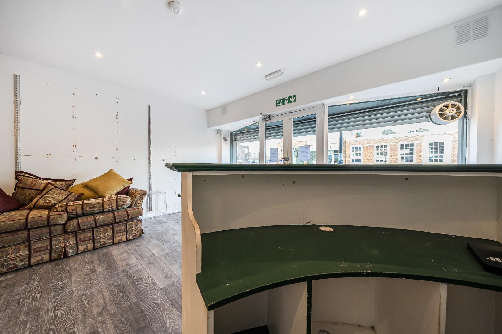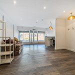This spacious shop offers a bright and inviting open-plan area with ample natural light streaming through large front windows and a central double-door entrance. The wooden flooring extends throughout, creating a warm and cohesive environment. A curved reception desk is positioned near the front, complemented by pendant lighting and a feature wall with a textured finish adding character to the space. Towards the rear, a small store room provides practical storage, while an adjacent WC with a sink is finished in contemporary tones, including a dark green accent wall. The shop is well-lit with recessed ceiling lights, and the overall layout is versatile, suitable for various business uses.