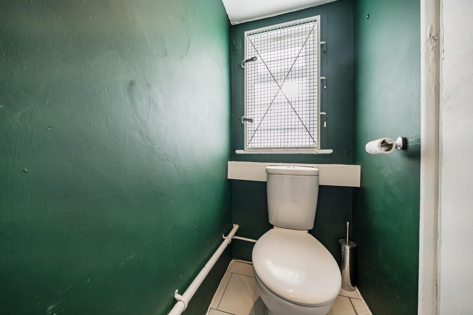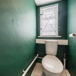 The WC is painted in a rich green shade, creating a distinctive yet calm atmosphere. It features a white toilet and a window with a security grille, allowing natural light to enter. The floor is tiled in a light colour, contrasting with the wall finish, while practical fixtures include a toilet roll holder and brush.