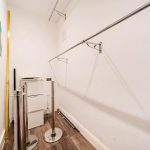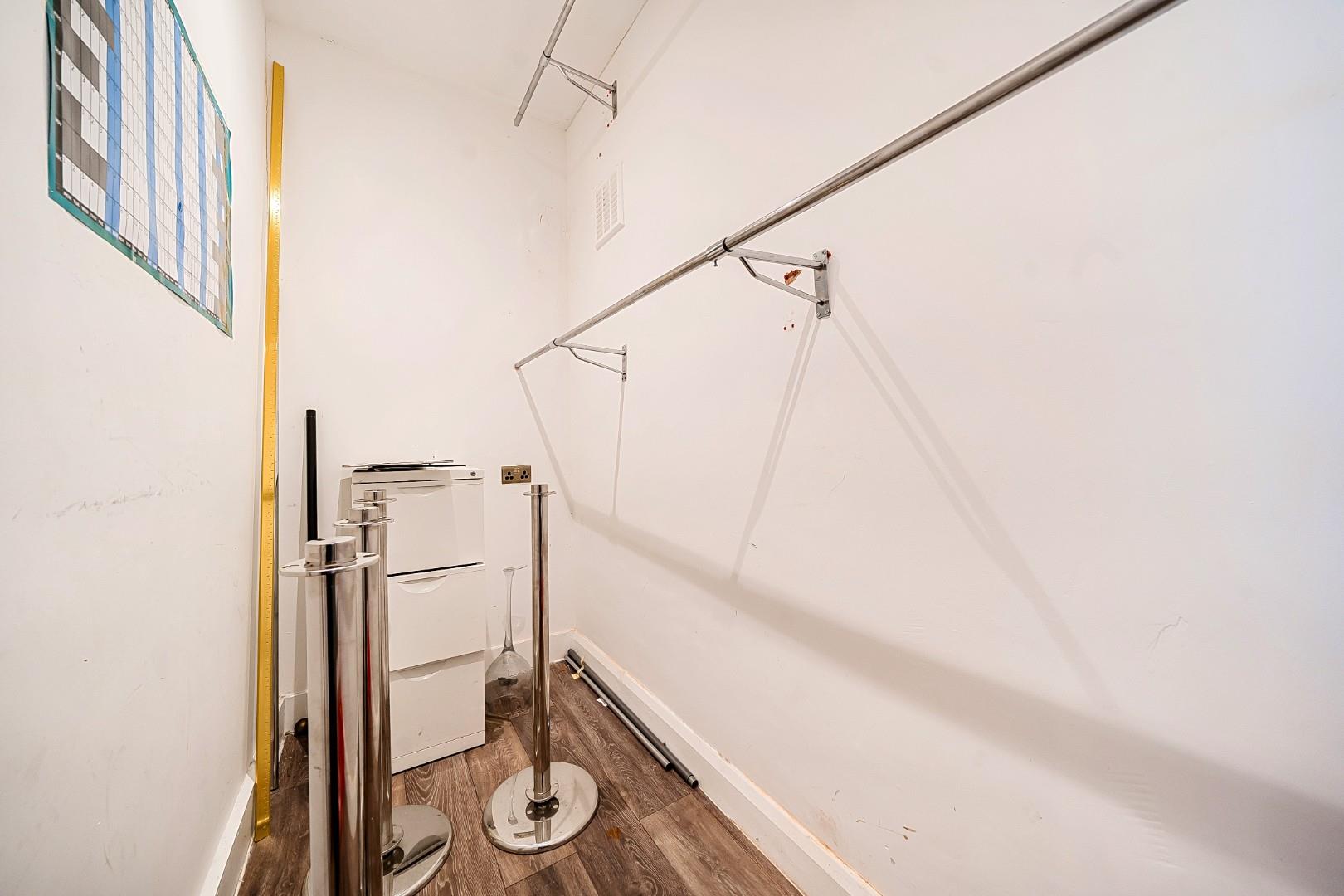 A compact store room is located at the rear of the shop. It is a narrow, functional space with white walls and wooden flooring that matches the main shop area. It provides useful additional storage for stock or equipment.