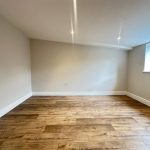 This bright living area features wood-effect flooring and is naturally lit by a large window beside the entrance door. The neutral walls and clean lines create a versatile space that can be easily adapted to your style and needs. The room benefits from ample recessed lighting and a modern heater, making it a comfortable and inviting spot to relax or entertain.