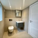 The bathroom is stylish and contemporary, featuring a walk-in shower with glass enclosure, a wall-mounted toilet, and a vanity unit with a basin. The walls and floor are finished with large, neutral-toned tiles, creating a clean and spacious feel. A backlit mirror adds both function and a touch of modern elegance, while a small frosted window lets in natural light.