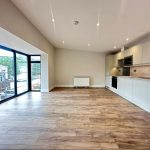 This bedroom offers a tranquil and practical space, with two vertical windows providing natural light and ventilation. It features the same wood-effect flooring found throughout the main rooms, and a neutral palette that makes it easy to personalise. There is an en suite bathroom accessed through an adjacent door, enhancing privacy and convenience.