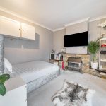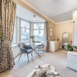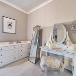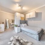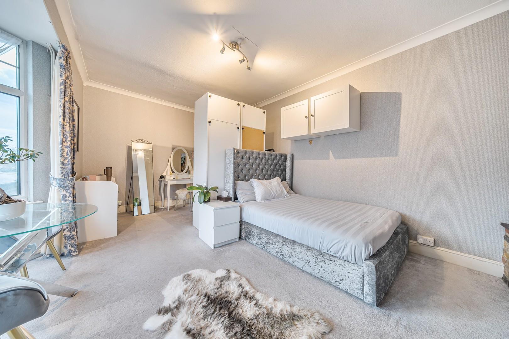 A spacious bedroom featuring a large bay window that brightens the room with natural light. The room is finished with soft grey walls and carpet, offering a calm and restful setting. It is furnished with a double bed, bedside tables, and a dressing table, with plenty of space for additional furniture. The room's generous proportions make it perfect for relaxation.