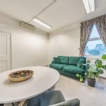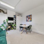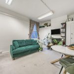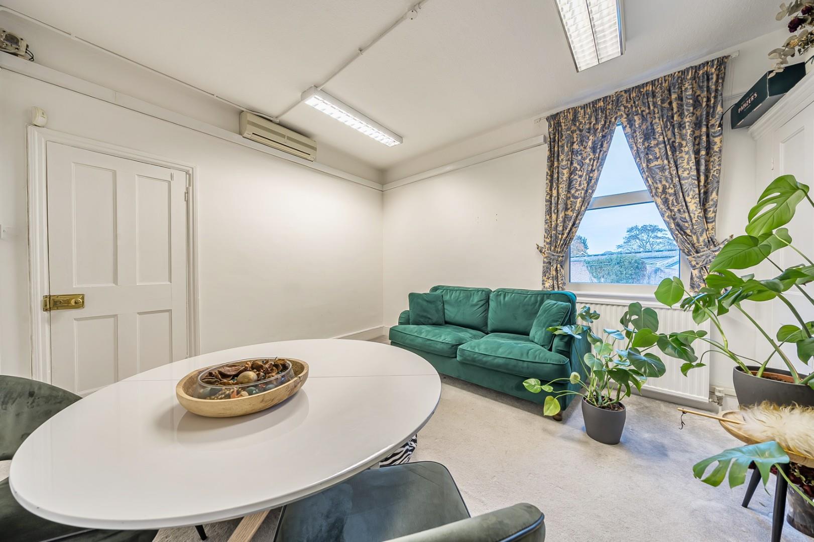 A bright and airy room presented with white walls and carpet flooring. It is furnished with a green sofa and a white oval table surrounded by comfortable chairs, making it well suited as a study or additional reception room. The large window allows for plenty of daylight to create a pleasant working or relaxing environment.