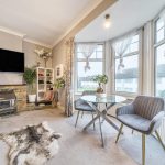 This inviting reception room features a bay window that fills the space with natural light. The room is presented with neutral walls and carpeted flooring, creating a warm and comfortable atmosphere. A stylish fireplace with a stone surround adds character, complemented by modern furnishings including a glass dining table and upholstered chairs, making it an ideal space for relaxing or entertaining.