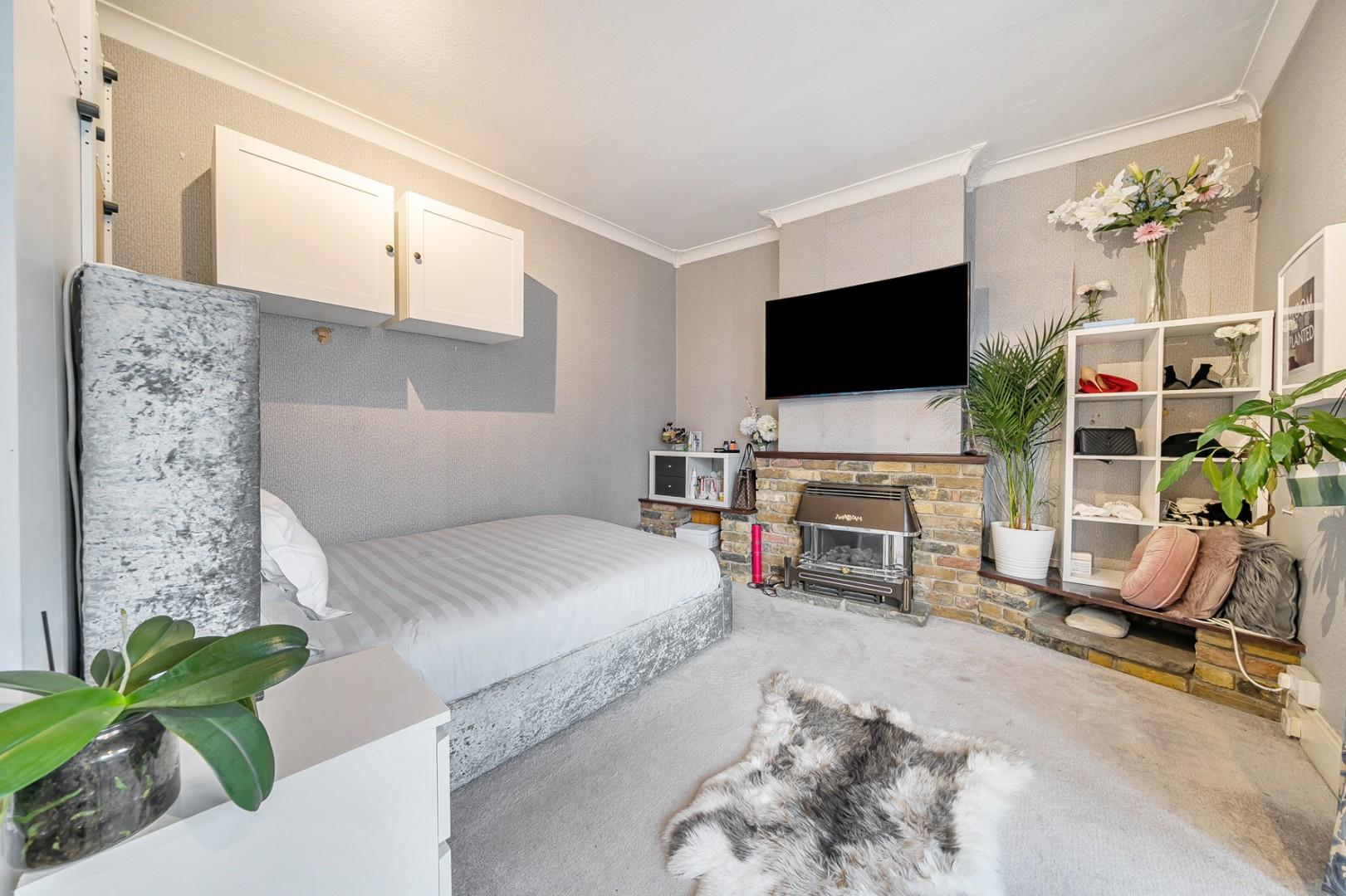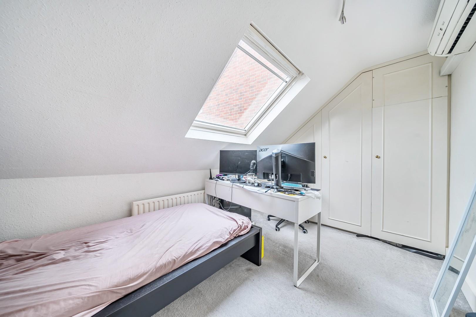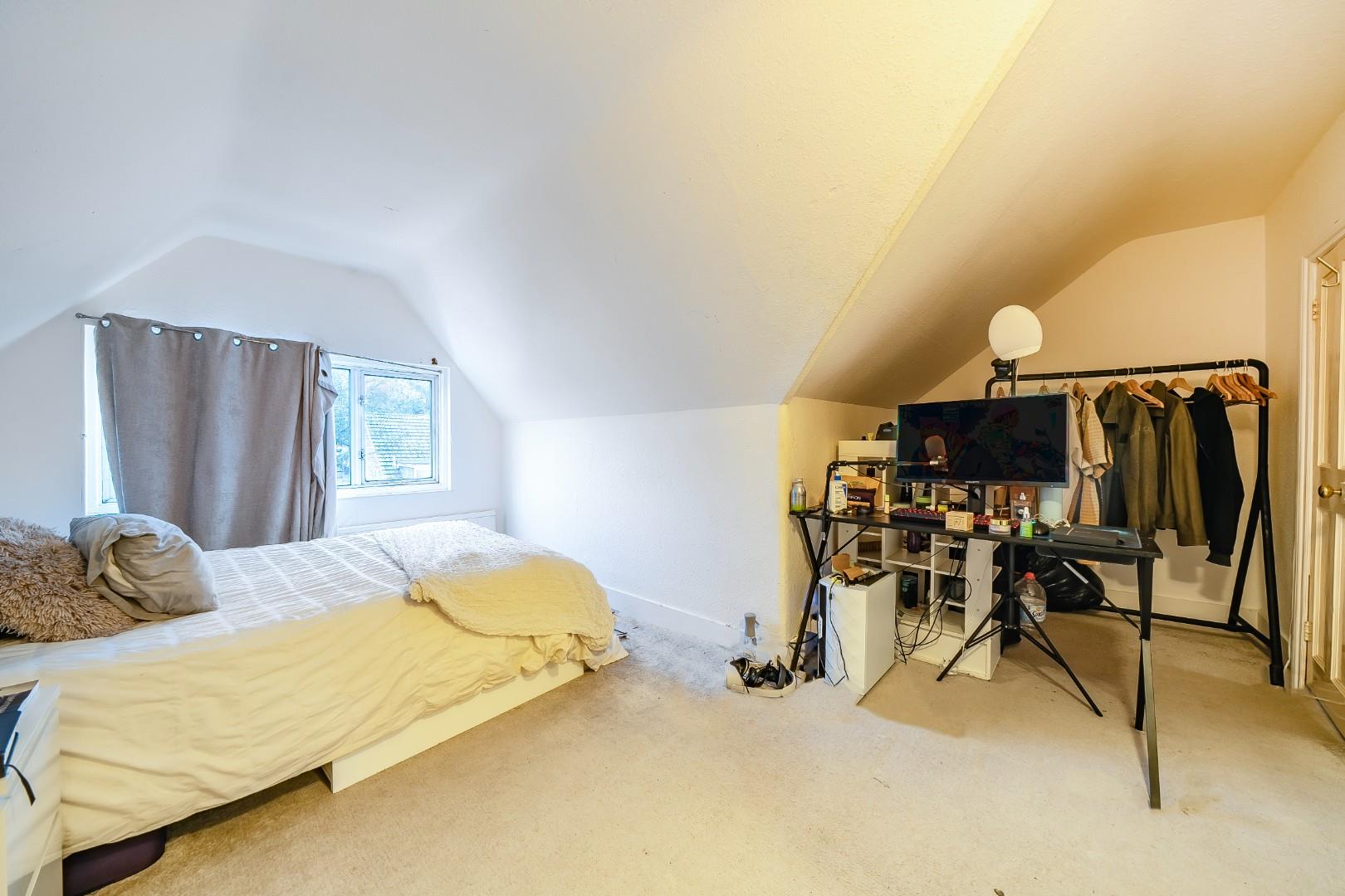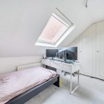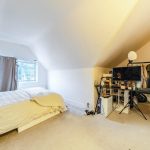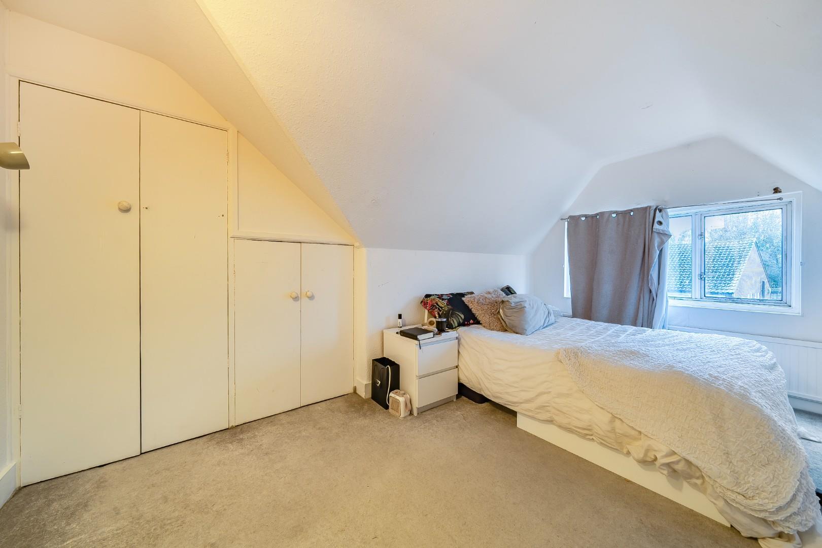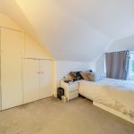 This third bedroom is a cosy space with a sloped ceiling and built-in storage cupboards. The room enjoys natural light from a window, offering a quiet retreat. Its size is ideal for a single bed or use as a study or hobby room.