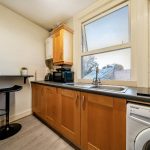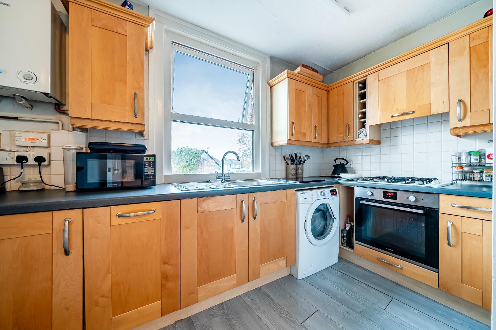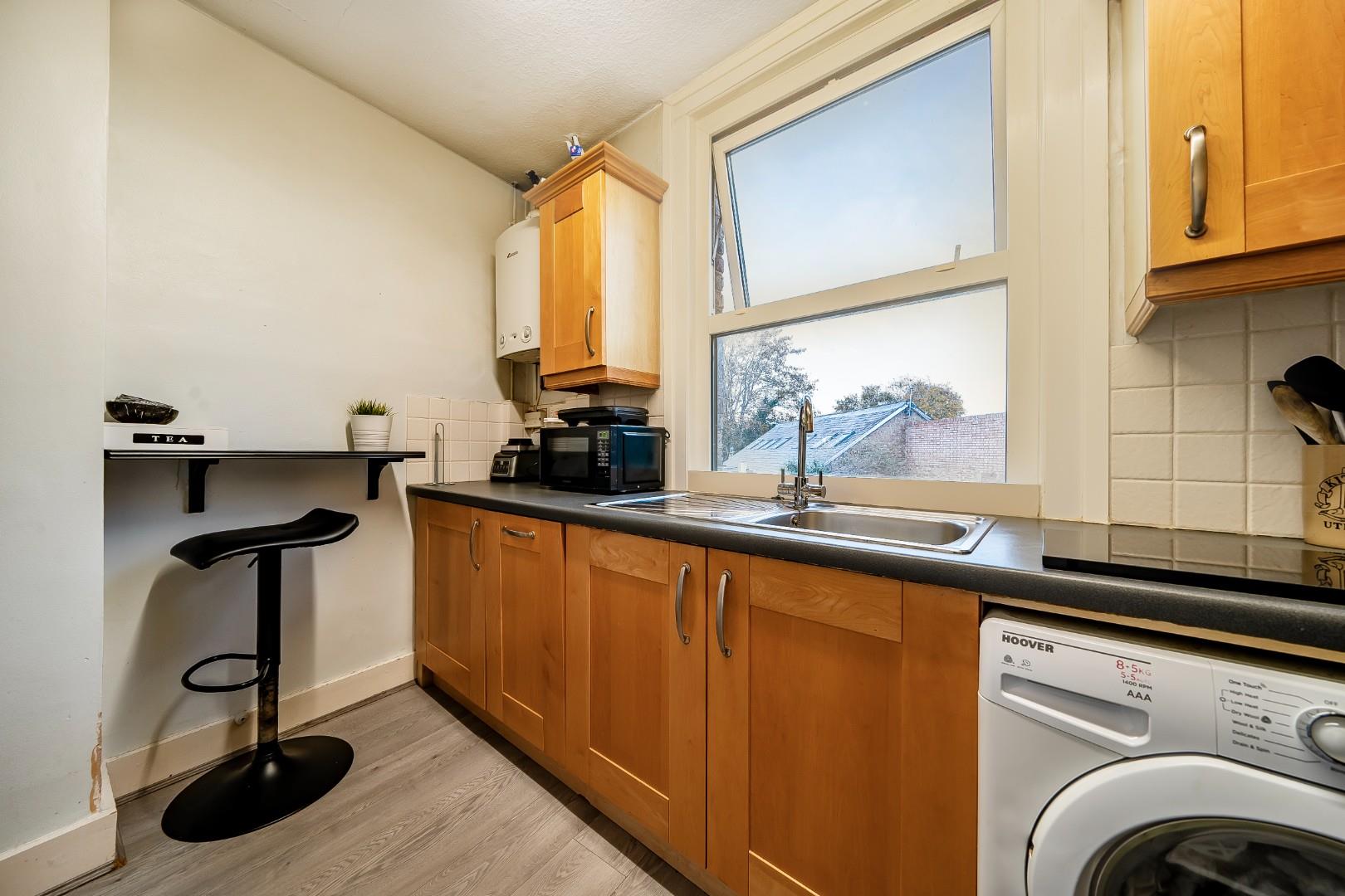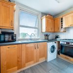 The kitchen is well-equipped with wooden cabinetry and dark countertops, providing ample storage and workspace. It includes an integrated oven, gas hob, washing machine, and microwave. A window above the sink offers pleasant views and natural light, while the flooring is practical and easy to maintain, making it a functional and efficient space for cooking and daily chores.