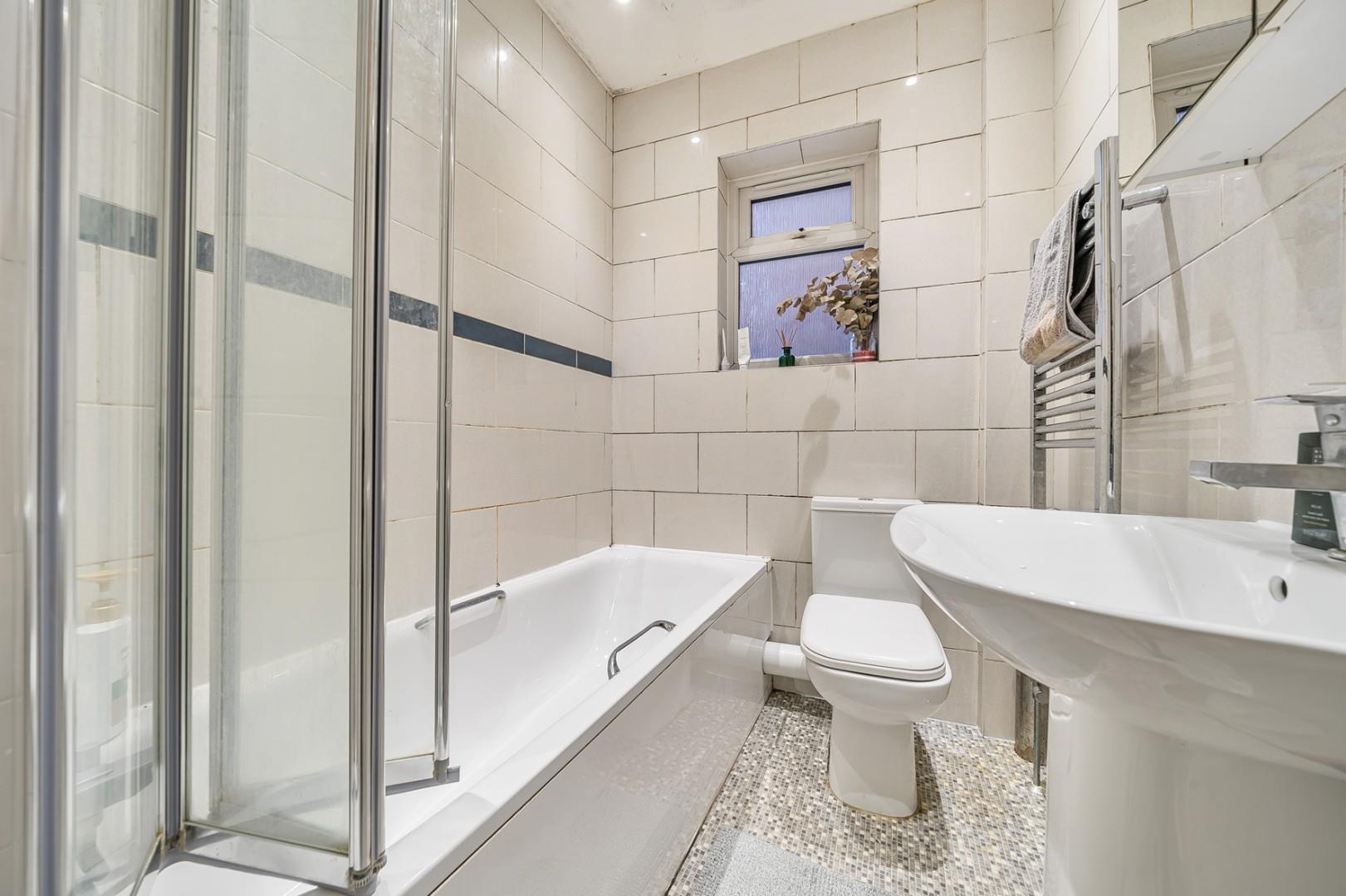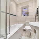 A contemporary bathroom fitted with a bathtub and overhead shower, complemented by crisp white tiling and a small window for ventilation. There is also a WC, a pedestal wash basin, and a heated towel rail, all arranged efficiently within the space. The bathroom’s neutral décor ensures a fresh and clean feel.