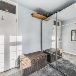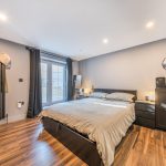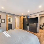 An attractive lower ground floor bedroom offers ample space for a large bed and bedroom furniture. It benefits from natural light through a patio doors overlooking the mezzanine patio, creating a calm and restful environment. The adjacent dressing room adds convenience and additional storage.