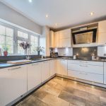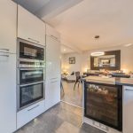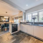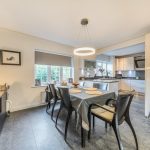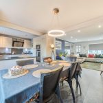 This open-plan kitchen and dining room is modern and well-appointed, featuring sleek cabinetry, integrated appliances, and a practical layout that maximises space. The dining area comfortably accommodates a table and chairs, making it a perfect spot for family meals or entertaining guests. Large windows ensure the space is filled with natural light throughout the day.