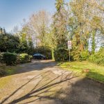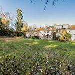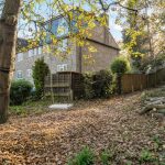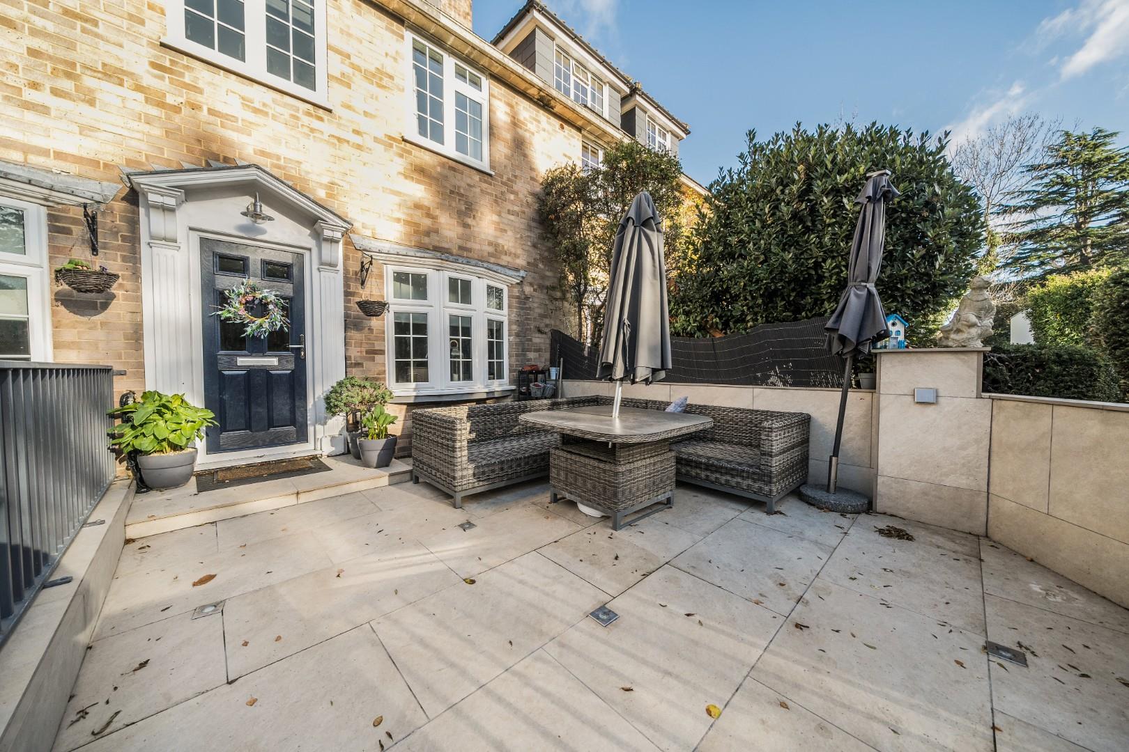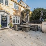 The rear garden offers a spacious, mostly paved patio area ideal for outdoor seating and entertaining. Beyond this, mature trees and greenery provide privacy and a peaceful backdrop, with a lawned area creating a perfect space for relaxing or gardening.