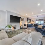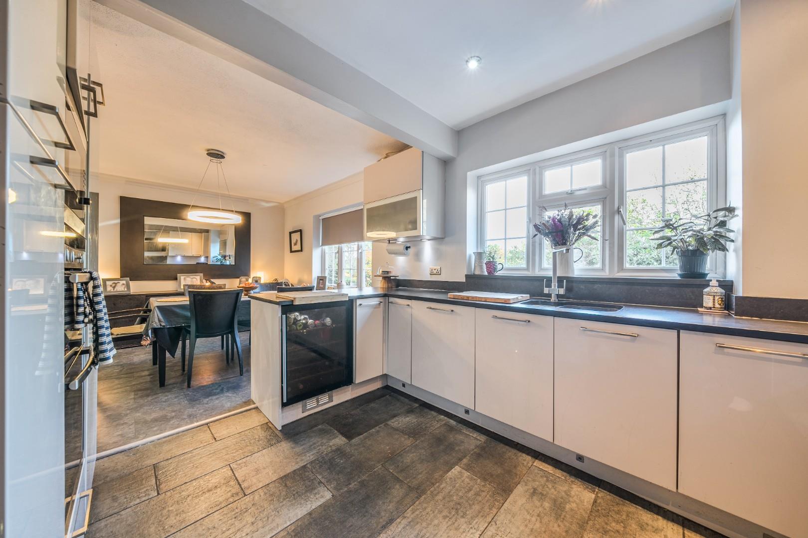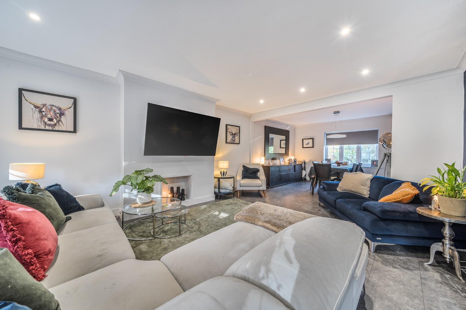 A spacious and inviting reception room features a generous layout with a cosy fireplace as its focal point. The room is bright with natural light from multiple windows and is designed to offer ample space for both relaxing and entertaining. It seamlessly connects to the kitchen and dining area, creating an open and sociable atmosphere.
