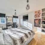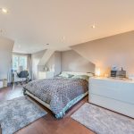 The master bedroom is a calm, inviting retreat featuring wood flooring that adds warmth and character to the room. The space benefits from a dormer window that floods the room with natural light and offers views over the garden. A stylish dressing room adjoins, with fitted wardrobes and additional space for storage or seating, providing a practical and elegant dressing area. The overall ambiance is peaceful, ideal for rest and relaxation.