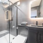 A stylish, contemporary en suite bathroom to the Master Bedroom with a walk-in shower, WC, and vanity unit. The clean lines and modern fixtures create a sleek and practical space.