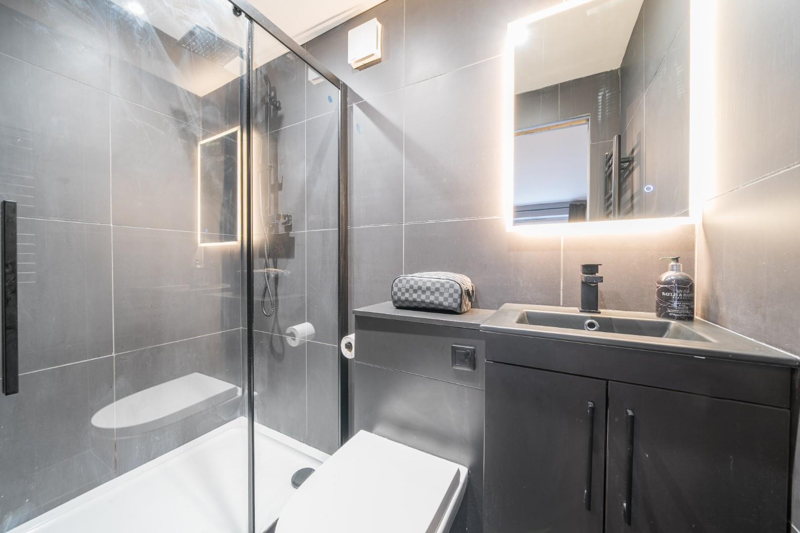 An ensuite shower room adjacent to Bedroom 2 offers a contemporary finish, complete with a walk-in shower, WC, and basin, providing convenience and privacy.
