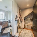 The lower ground floor hall is a practical entry space with access to the store room and dressing room. It provides a welcoming transition into the home, with natural light from the entrance area enhancing the space.