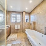 A stylish family bathroom fitted with modern fixtures including a freestanding bathtub, walk-in shower, and dual basin vanity. The neutral tiling and large window provide a bright, contemporary feel to this relaxing space.