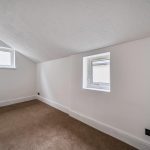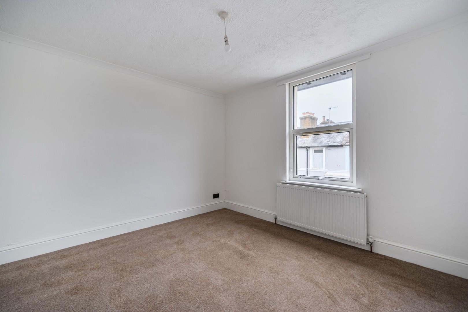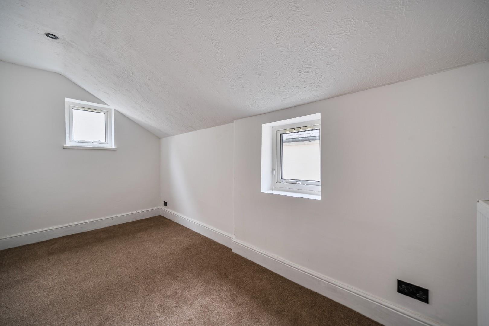 Bedroom 2 is a long, narrow room at the rear of the first floor. It is decorated with neutral walls and brown carpeting and features two small windows that bring in natural light. The room measures 4.17 metres by 2.06 metres, providing a cosy space ideal for a single bed or as a study.