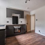 The kitchen is fitted with sleek, modern black cabinetry complemented by wooden work surfaces, offering ample storage and workspace. It includes an integrated oven and hob, with a window above the sink that provides natural light and views to the outside. The flooring continues with a wood-style finish, enhancing the contemporary feel of the room.