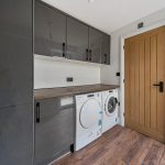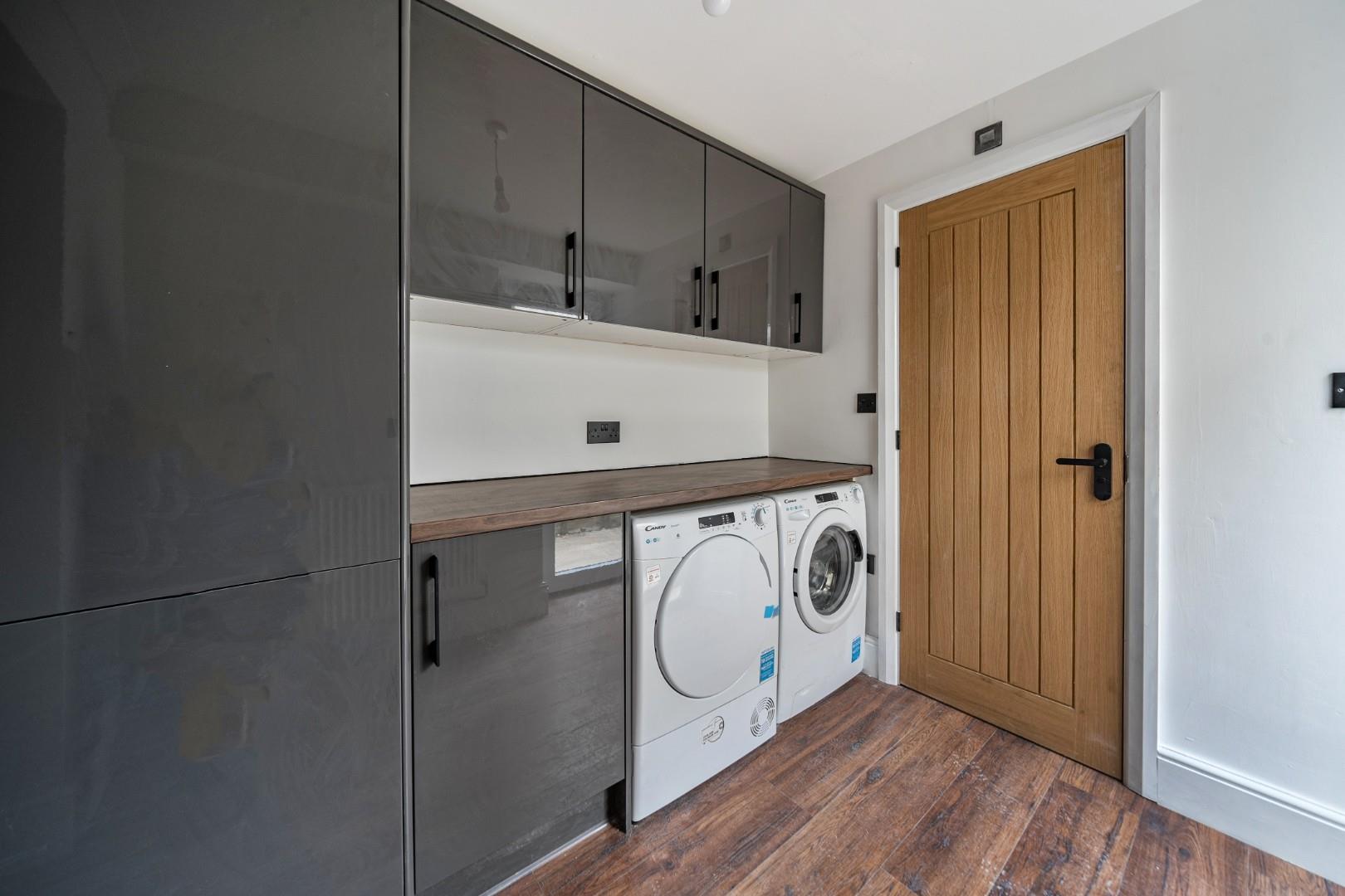 Adjacent to the kitchen, the utility room benefits from generous built-in cupboards above and below the work surface, housing both a washing machine and a tumble dryer. The room is practical and well-lit, with a window and the same wood-style flooring continuing from the kitchen.