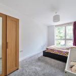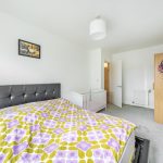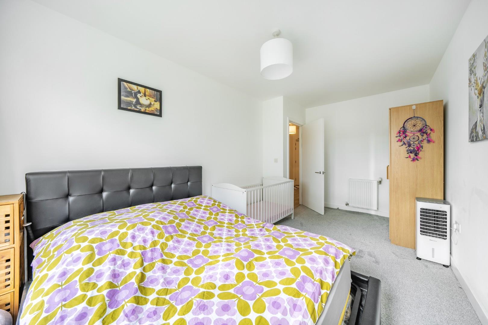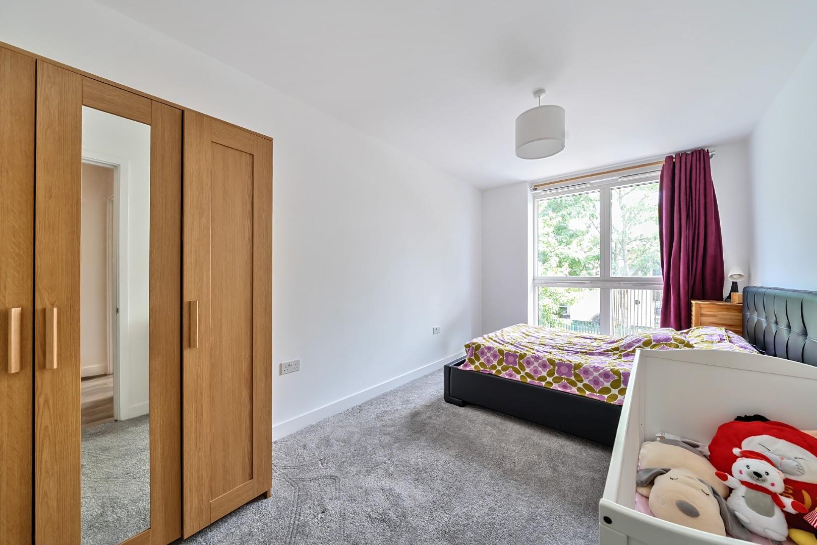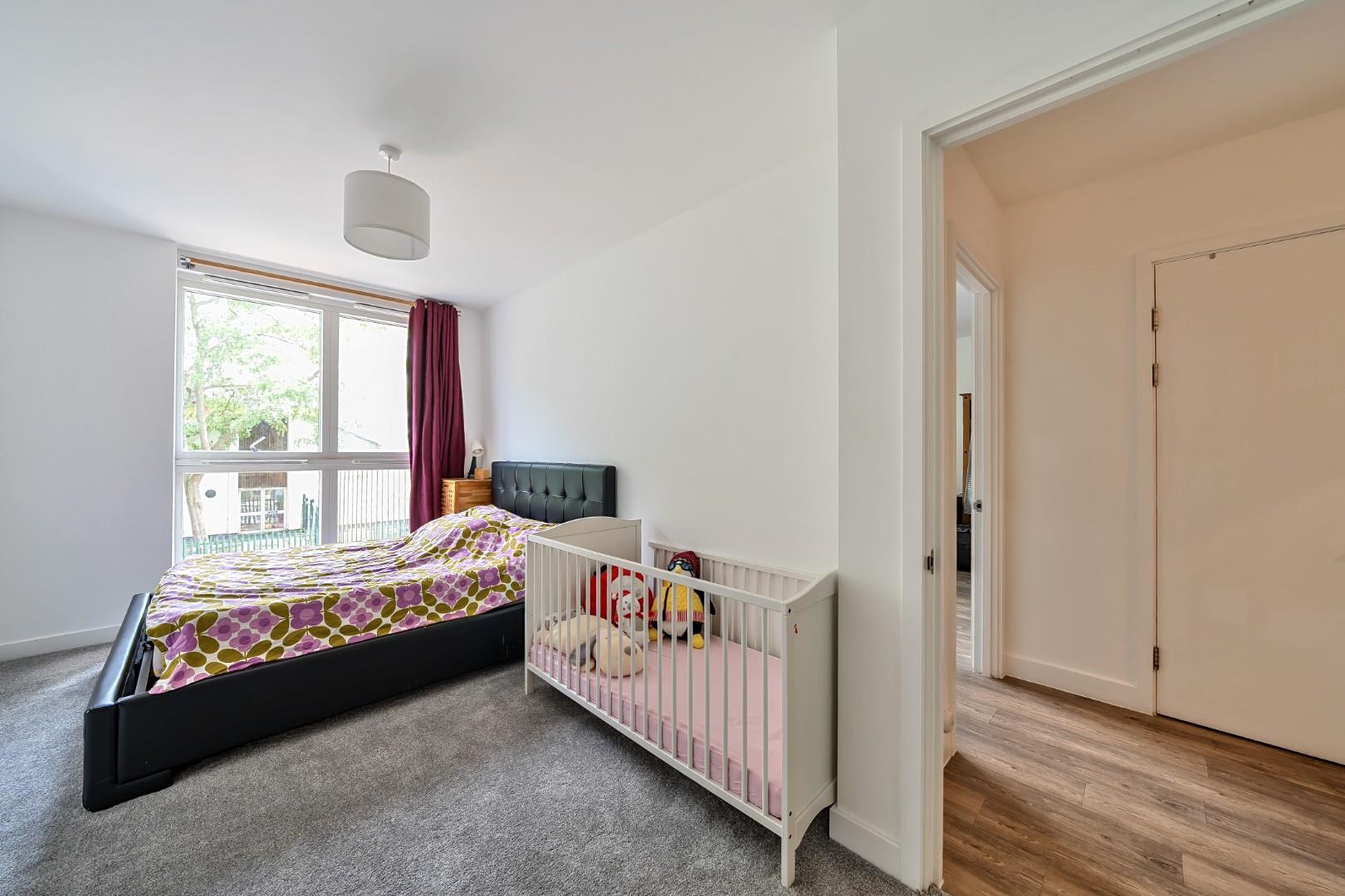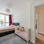 The bedroom offers a peaceful retreat with a soft grey carpet underfoot and large windows that fill the room with natural light. It comfortably accommodates a double bed and a cot, with additional space for storage including a wooden wardrobe. Neutral decor and simple furnishings create a calm and restful atmosphere.