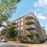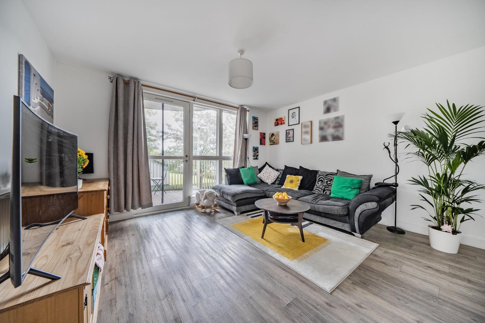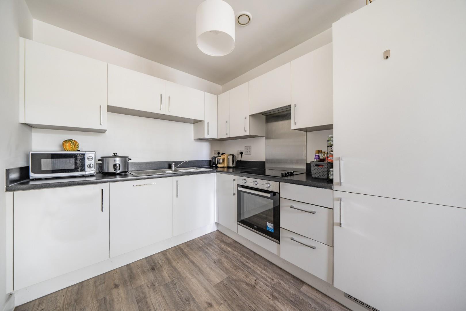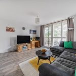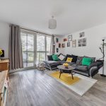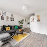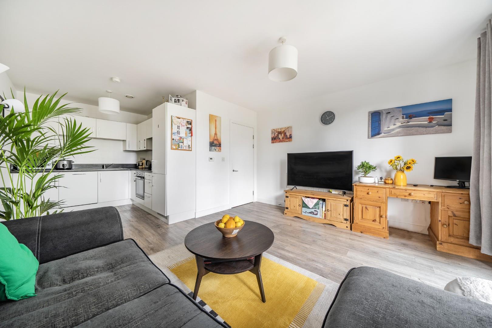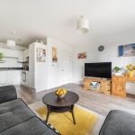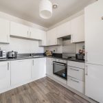This open-plan kitchen, reception, and dining area is bright and spacious, featuring ample natural light from large glass doors that open onto the balcony. The kitchen is fitted with sleek white cabinets and modern appliances, including an integrated oven, hob, and microwave. The wood-effect flooring continues throughout the space, enhancing the contemporary feel. A comfortable seating area is arranged around a circular coffee table, creating a welcoming space for relaxation and entertainment.