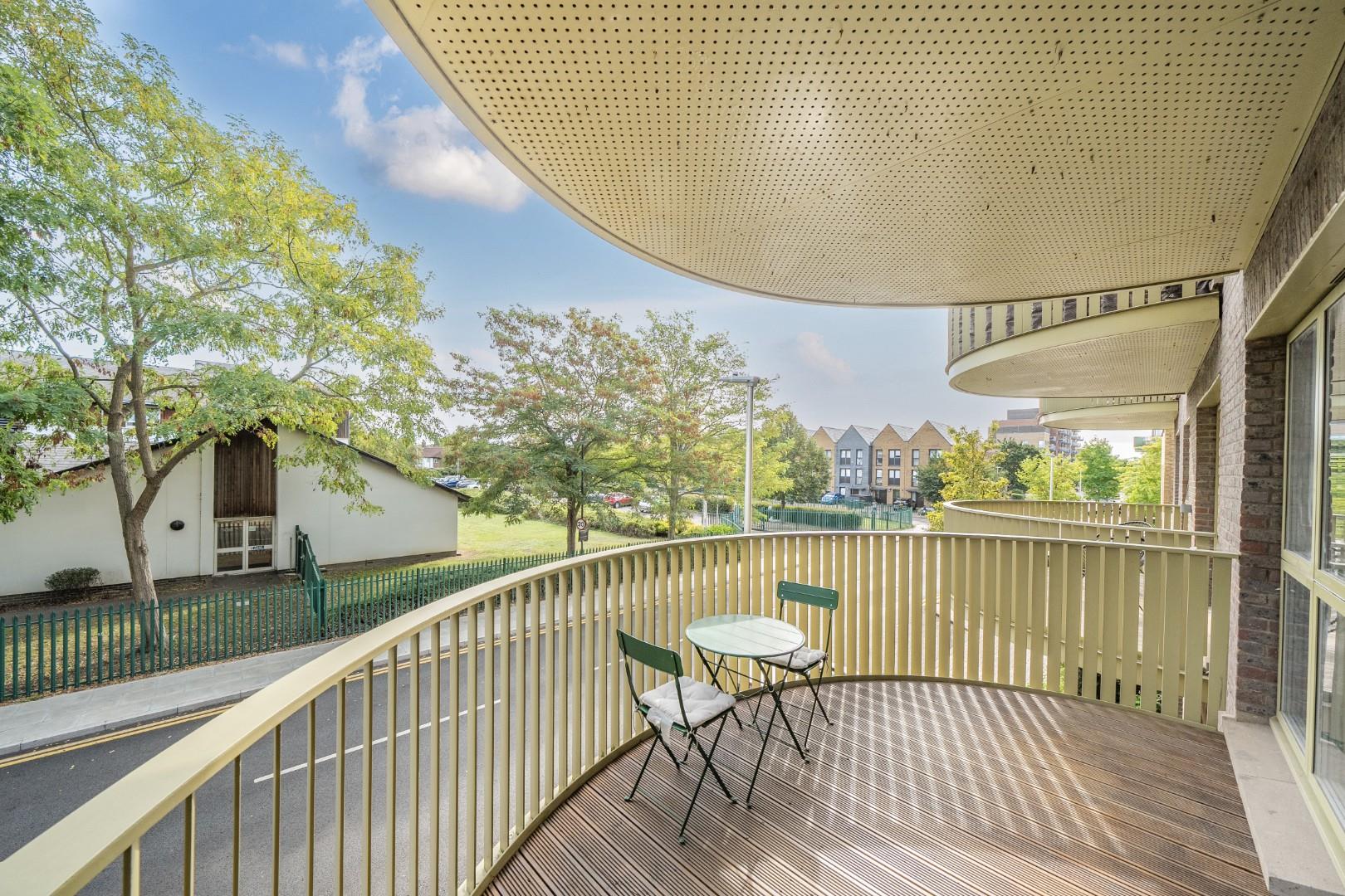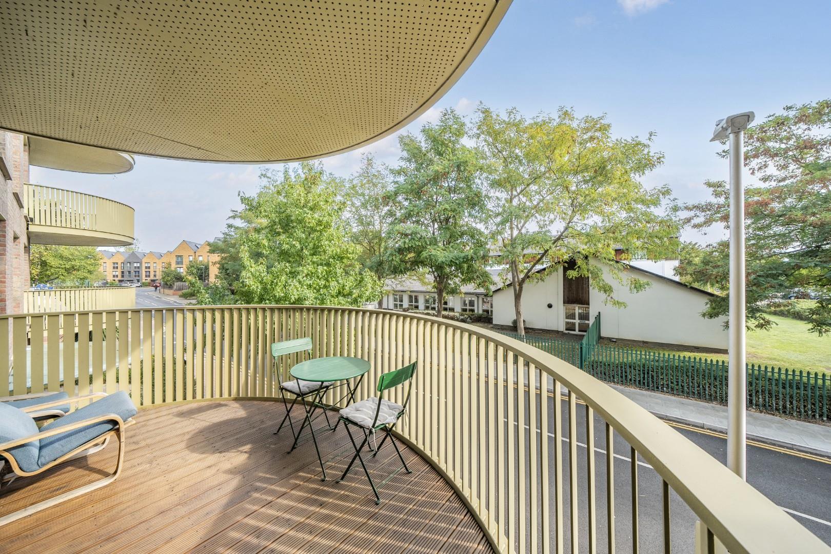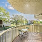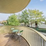 The balcony is a charming outdoor space with a curved design, finished with wooden decking and surrounded by a pale green railing. It provides a pleasant spot for outdoor seating and enjoys views of the surrounding greenery and neighbourhood. This private area is perfect for morning coffee or relaxing in the fresh air.