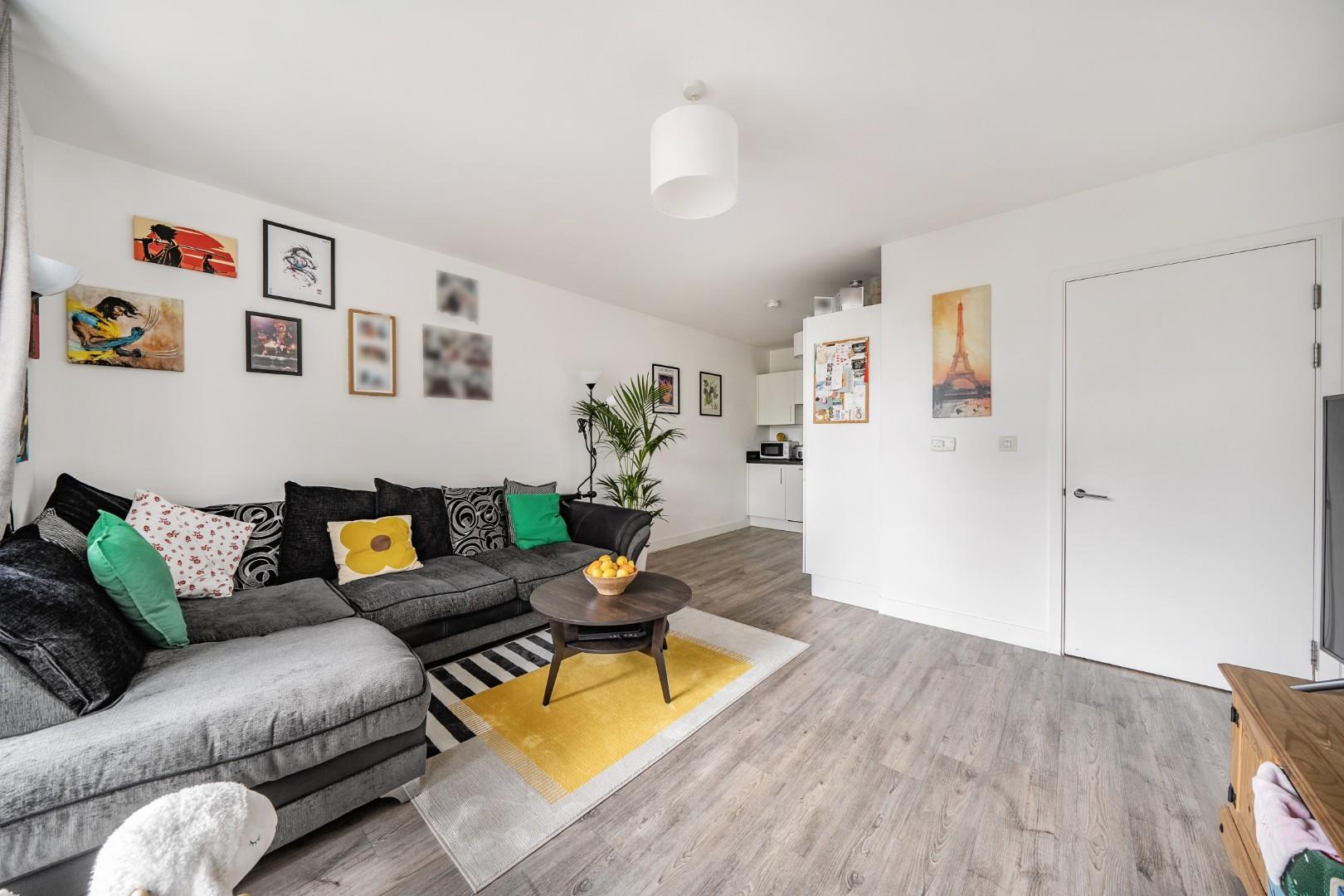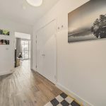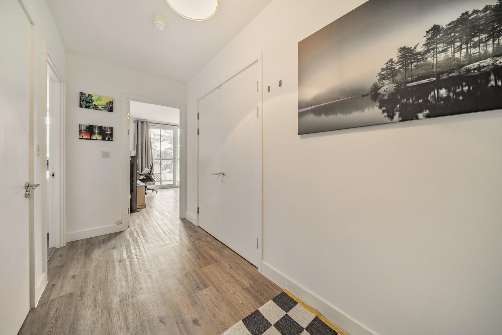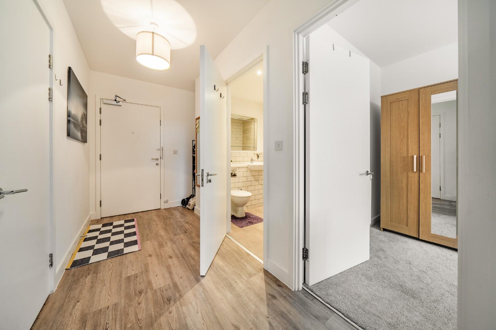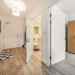 The hallway is practical and welcoming, featuring wood-effect flooring that matches the main living areas. It provides access to the bedroom, bathroom, and kitchen/reception room, with a simple, clean design that maximises space.