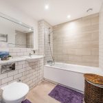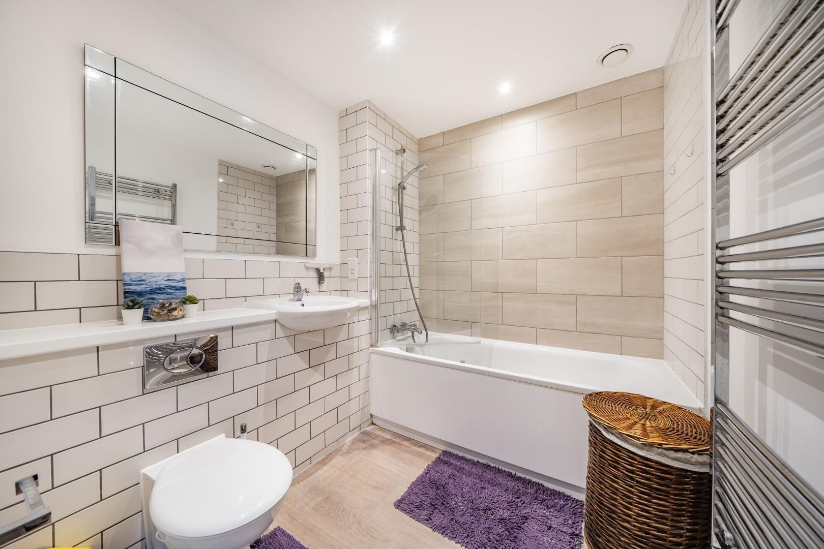 The bathroom is finished to a high standard with contemporary tiling in neutral tones. It features a bathtub with an overhead shower, a large mirror above the sink, and a sleek chrome towel radiator. The white sanitaryware complements the clean and modern look of the space.