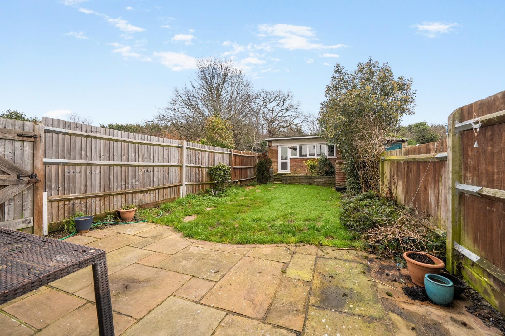 Set to the rear of the property, the garden offers a private and peaceful outdoor space. It features a paved patio area leading onto a well-maintained lawn bordered by mature shrubs and a wooden fence. At the far end, there is a workshop or office building providing versatile space for work or hobbies.