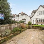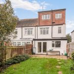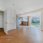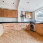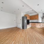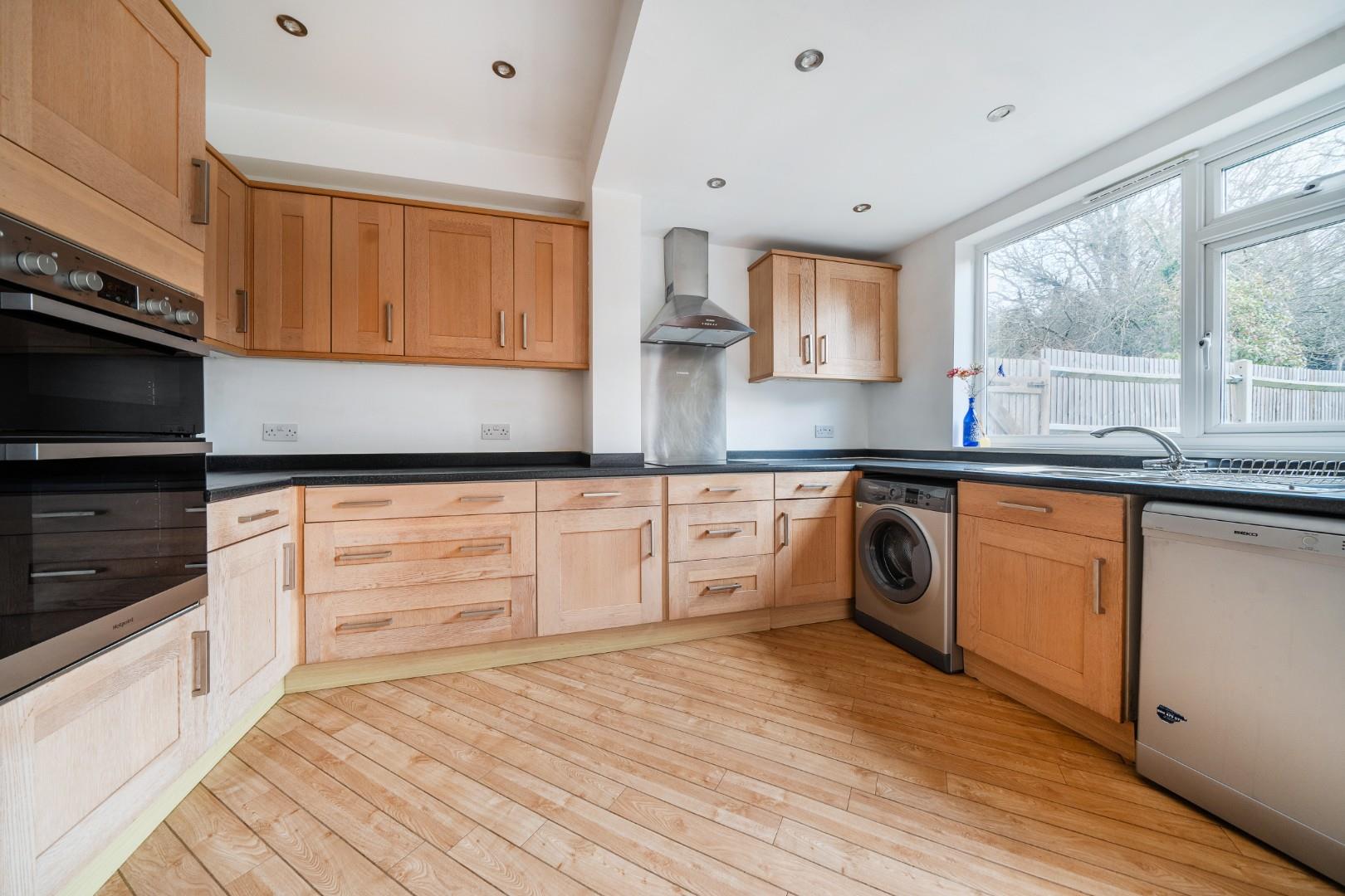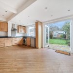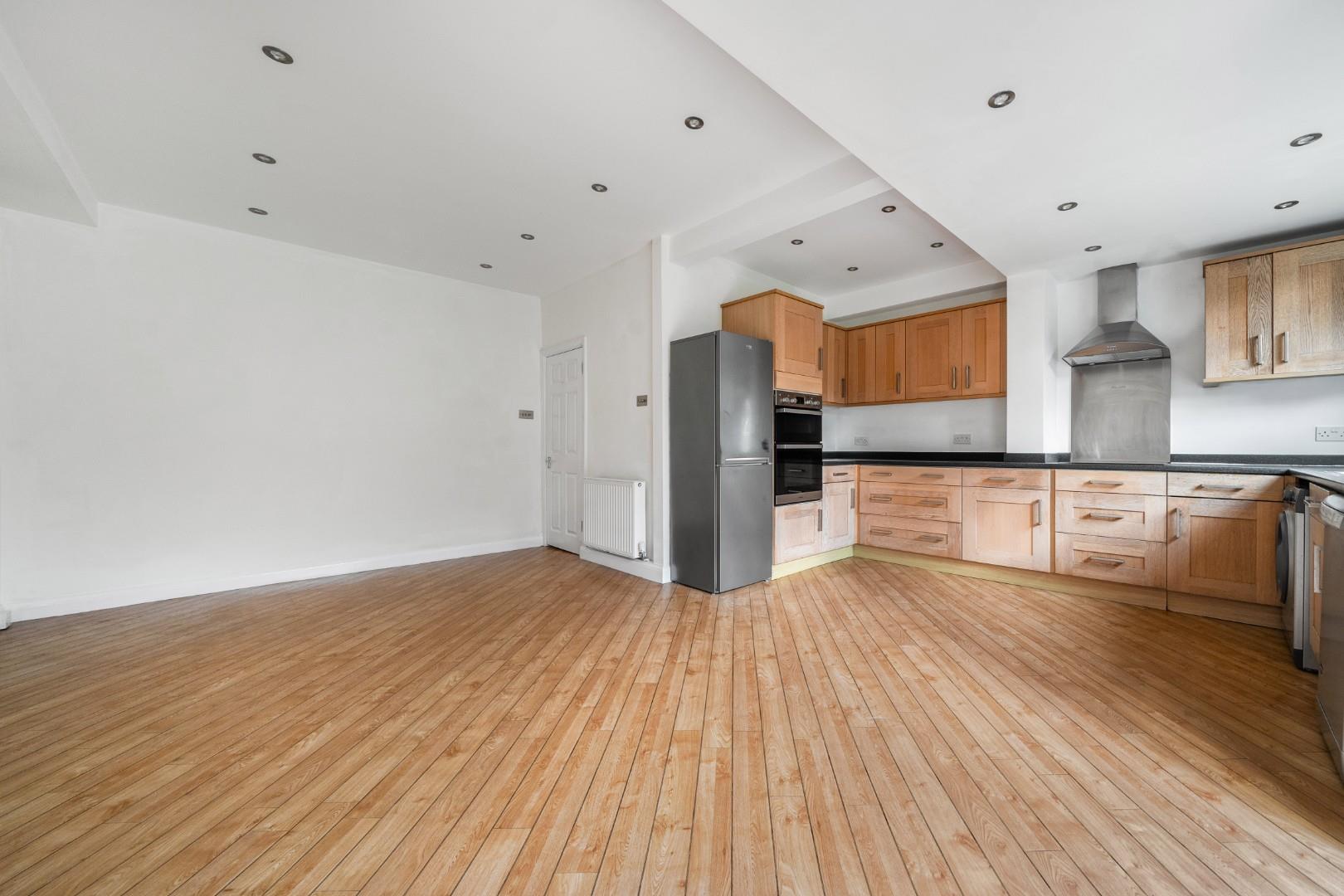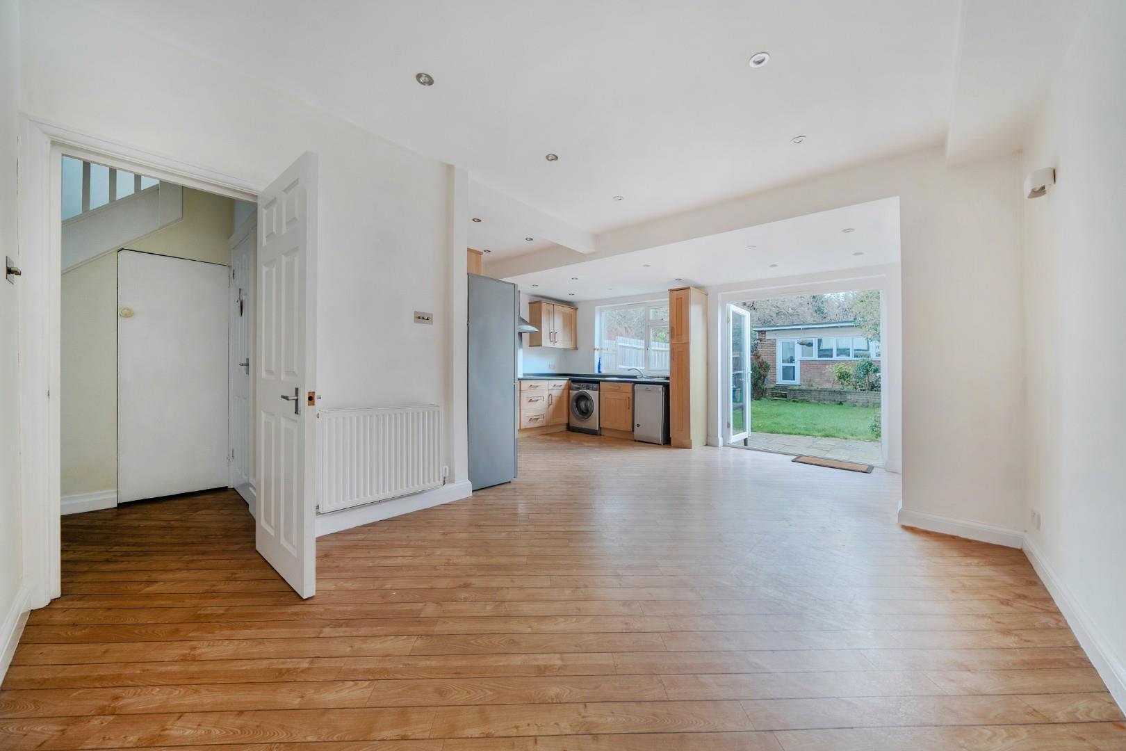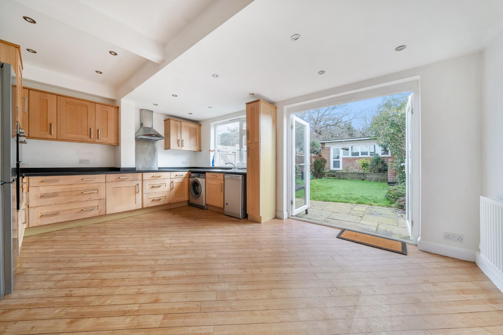 The kitchen and dining area form a generous open-plan space at the rear of the property, with wooden flooring and contemporary recessed lighting. Fitted with a range of wooden cabinets and black worktops, it includes integrated appliances and ample room for dining. French doors open directly onto the garden, bringing in plenty of daylight and allowing easy access to the outdoor area.