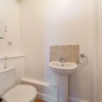 A second bathroom on the top floor features a shower enclosure, toilet, and basin with built-in storage. A window looks out to the rear, and the room is finished in neutral, easy-to-clean surfaces, providing a practical and fresh en-suite facility.
