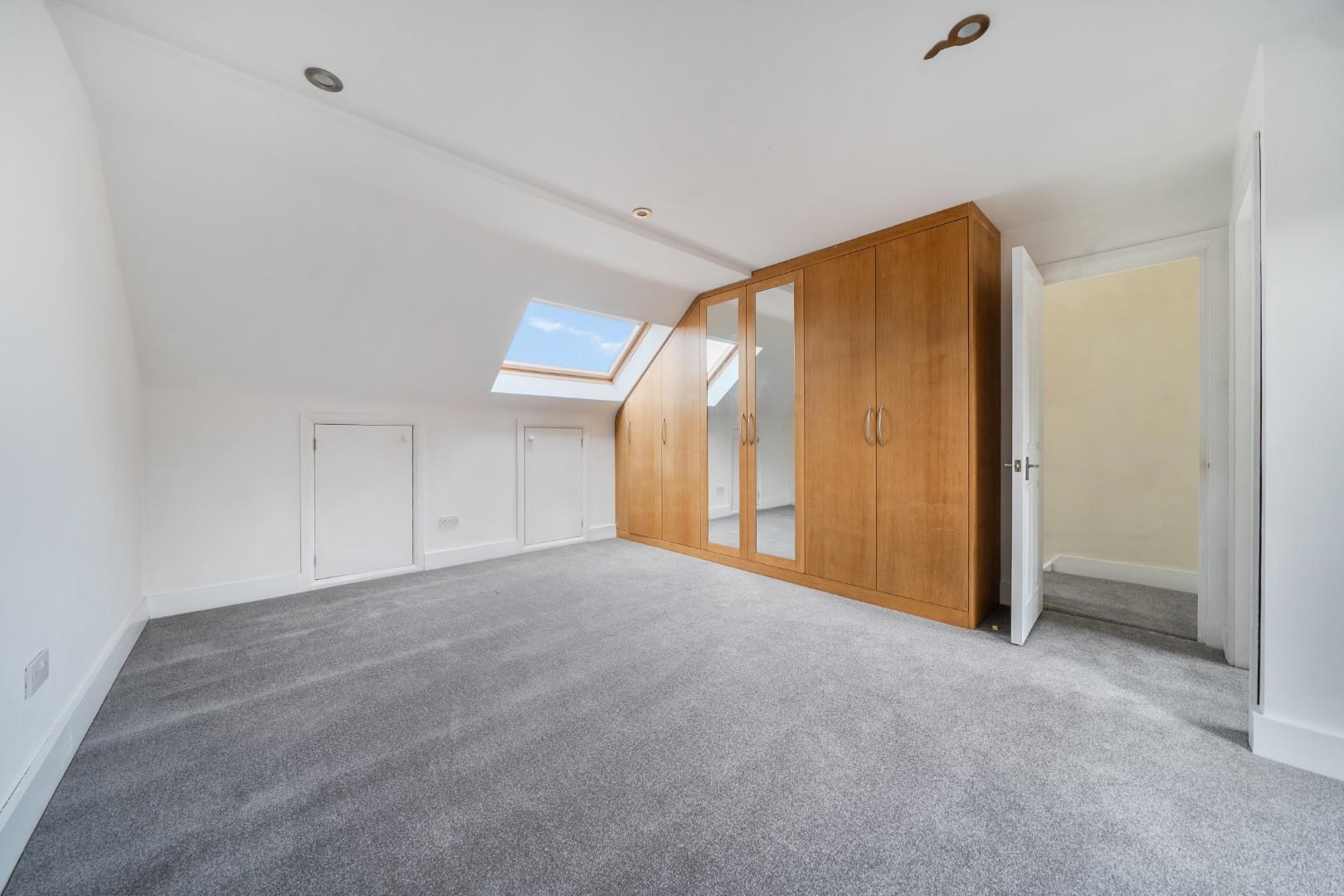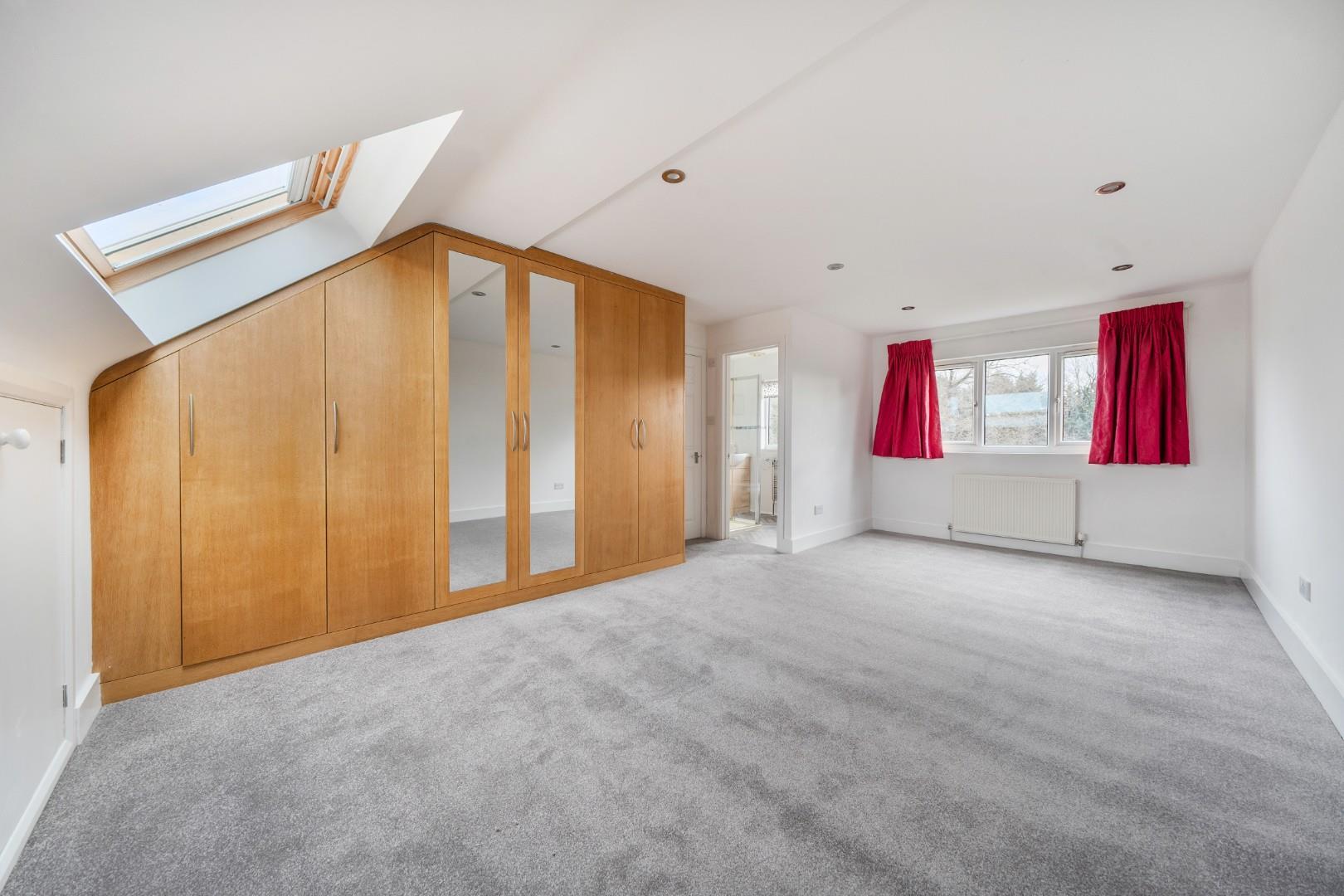 This well-proportioned main bedroom enjoys generous space with fitted wardrobes along one wall, finished in a warm wood tone with mirrored doors. A skylight and front-facing window fill the room with light, and the room benefits from an en-suite shower room for added privacy and convenience.
