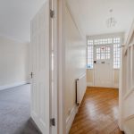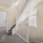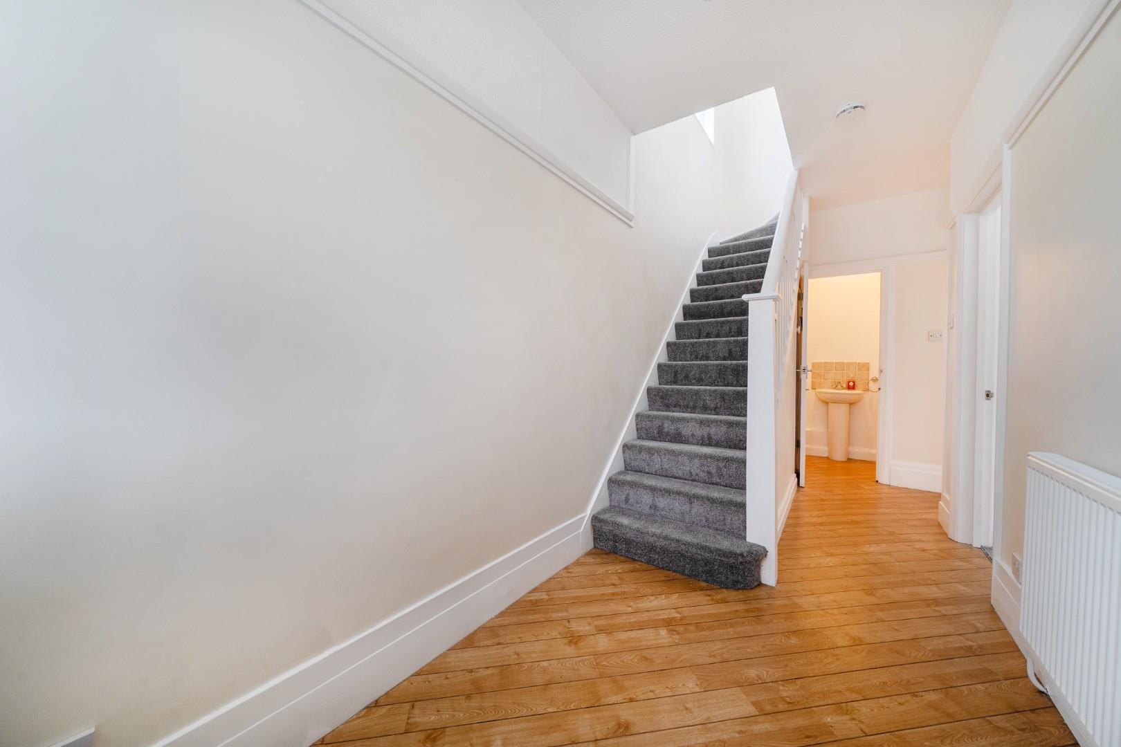 Welcoming and bright, the hall features wooden flooring that flows seamlessly through the ground floor. It offers access to the stairs leading to the upper floors and an under-stairs cloakroom with a toilet and a basin, providing convenient facilities for guests.