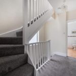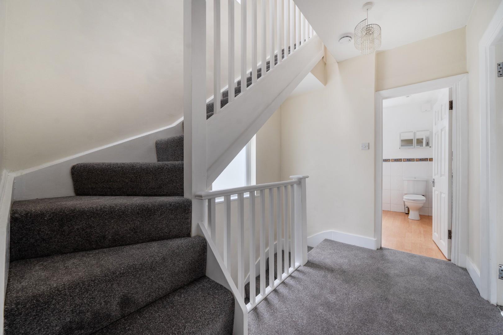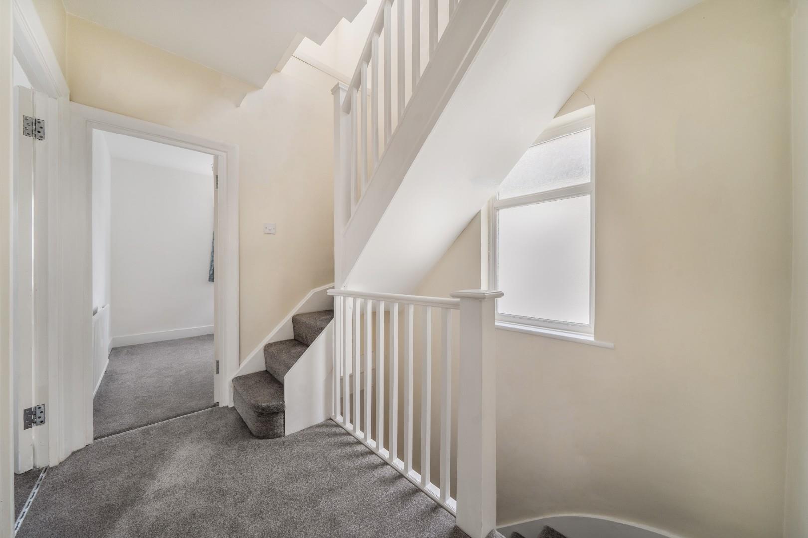The landing on the first floor is carpeted in grey and provides access to all bedrooms and the bathroom. The stairwell is light and airy, with views through a window to the outside.