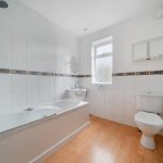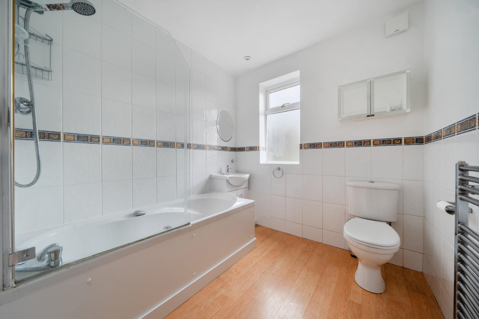 A fully tiled bathroom on the first floor includes a bath with shower, basin with vanity storage, and WC. A window provides natural light and ventilation, adding to the bright and fresh feel of the space.